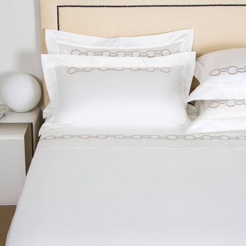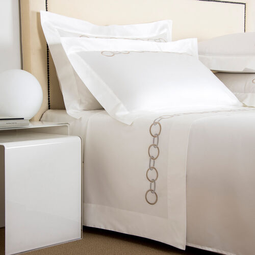 Featuring a intricately embroidered dual-tone chain design on the top sheet and shams, the Links Embroidered Sheet Set brings elegance to any master or guest bedroom. This sheet set includes a top sheet, two shams, and a bottom sheet in pure long-staple cotton sateen. 100% cotton. Made in Italy.