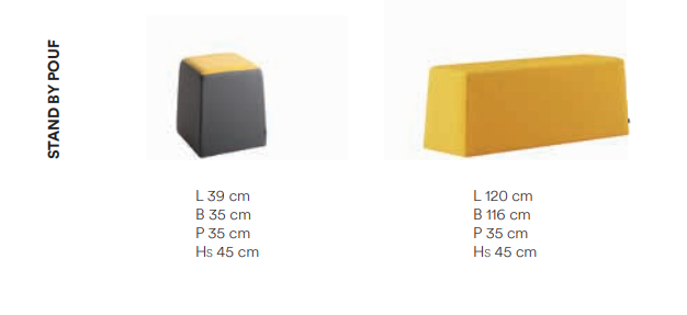Stand by Pouf è interamente rivestito con struttura interna in EPS (polistirene espanso sinterizzato) e materiale ligneo, imbottito in poliuretano flessibile e rivestito in tessuto o finta pelle.