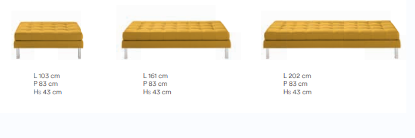 Dimensioni compatte, come si richiede in un ambiente di lavoro, schienali bassi e profondi e sedute molto ampie caratterizzano questa collezione, composta da un modello di poltrona, un divano due posti, un divano tre posti e quattro differenti modelli di panca (103 cm monoposto, da 161 cm a due posti e da 202 cm a 3 posti; i divani hanno le stesse lunghezze delle panche).