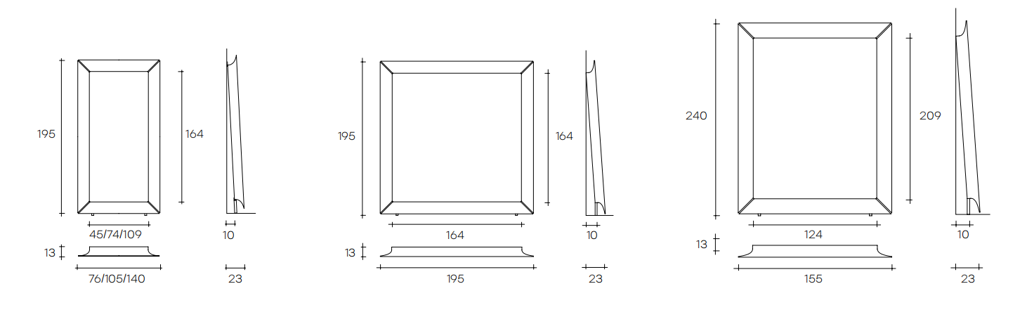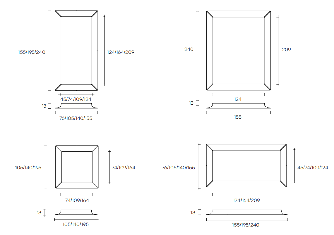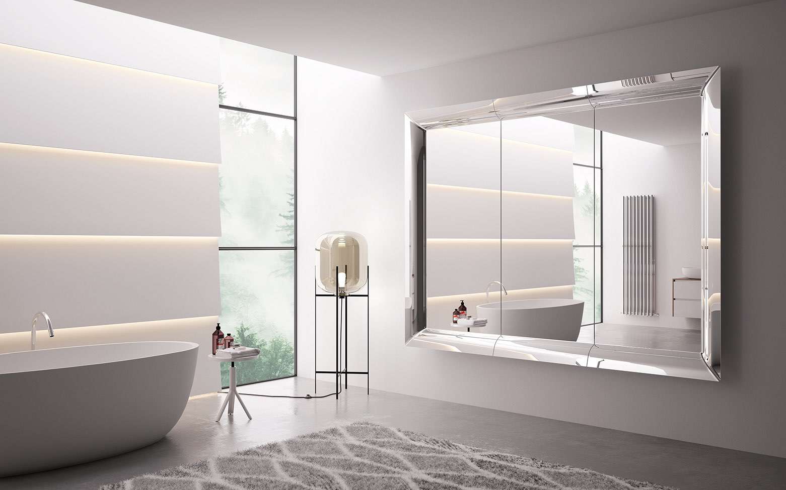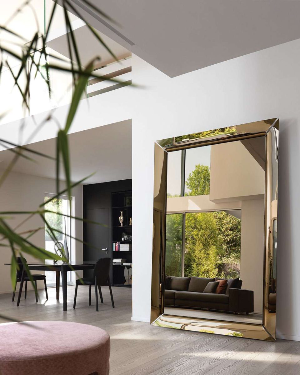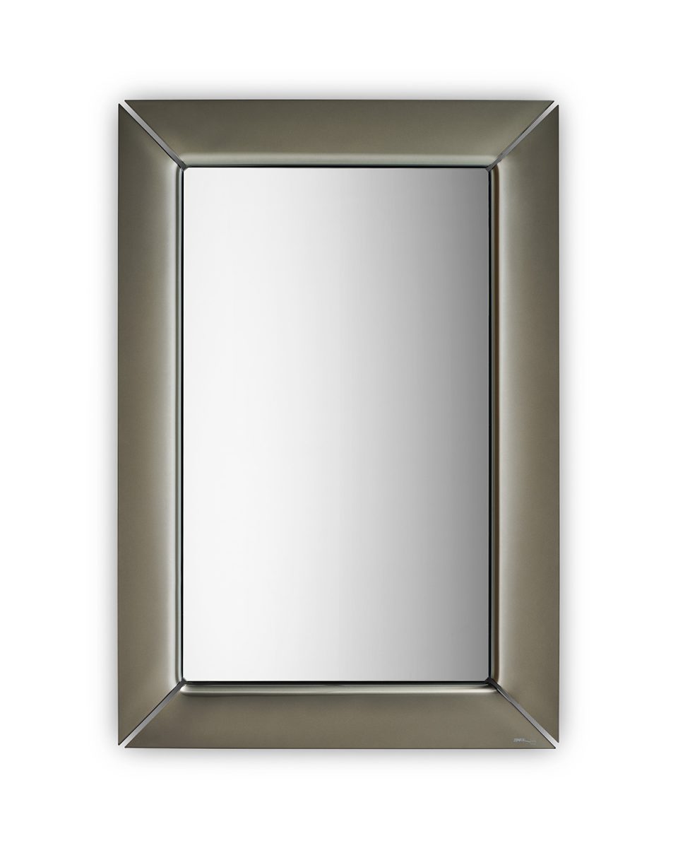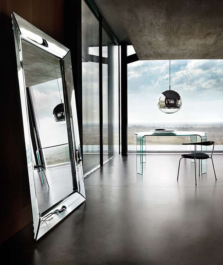Specchio da parete o da terra con cornice formata da quattro elementi singoli in vetro da 6 mm curvato e retroargentato.