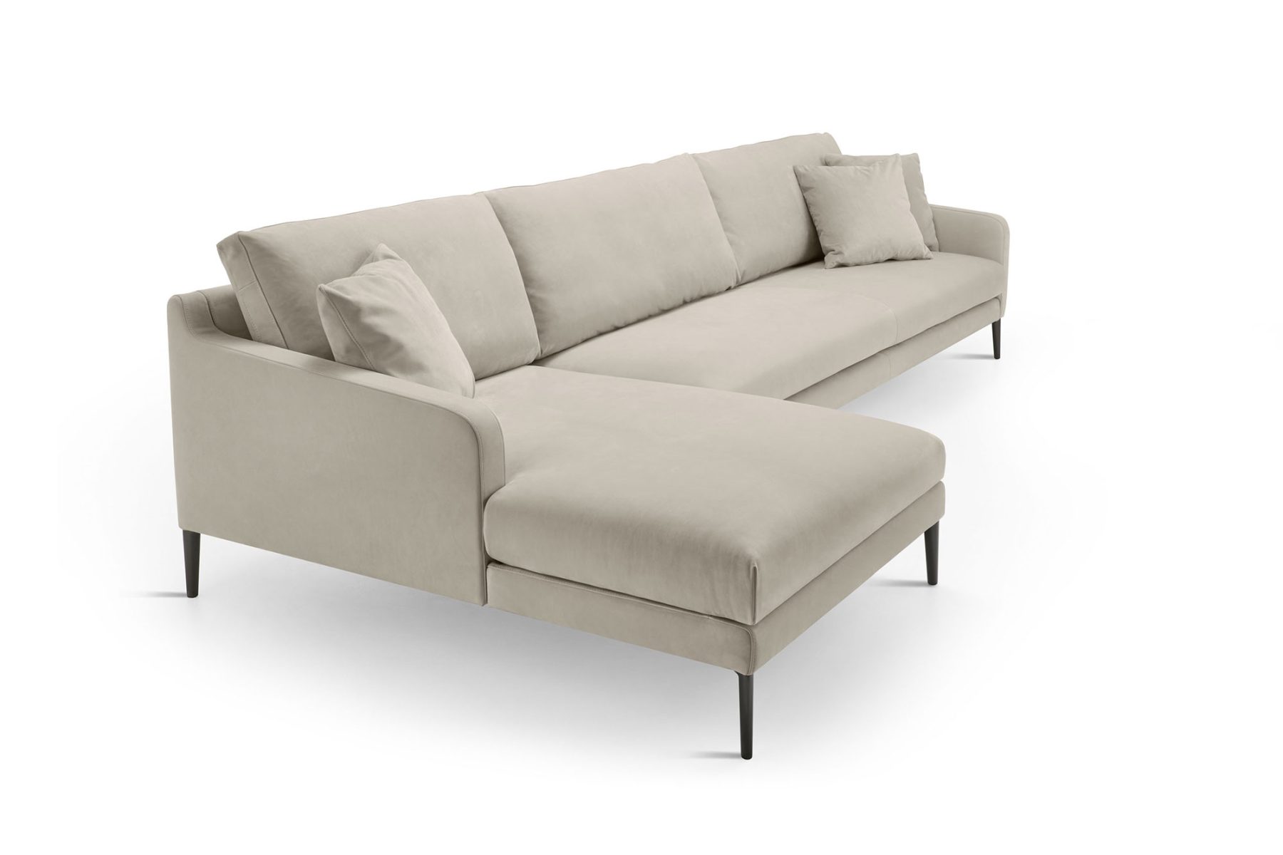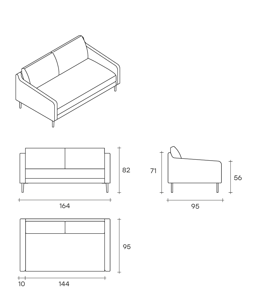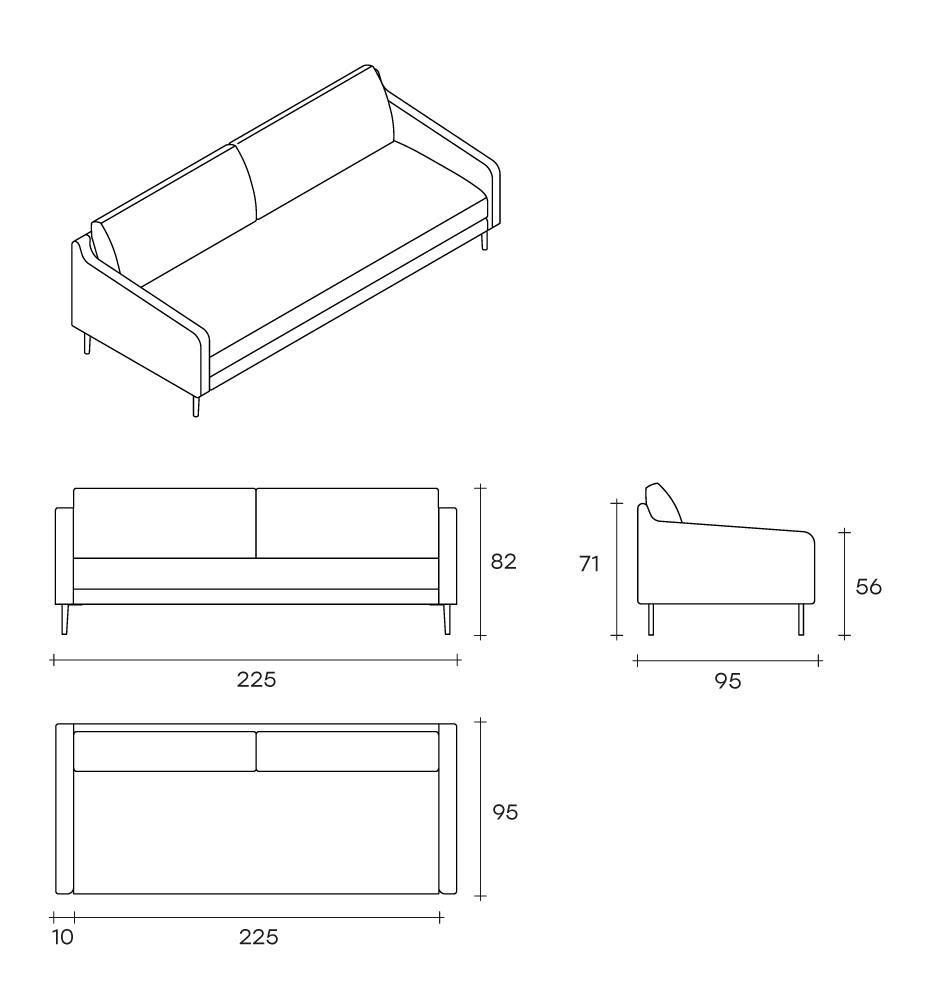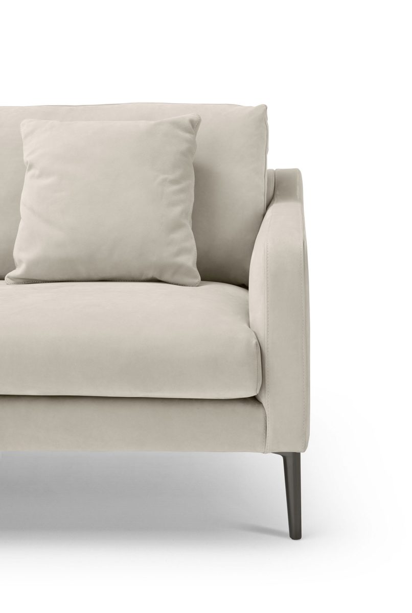 Divano fisso o componibile con struttura interna in legno multistrato. Molleggio seduta con cinghie elastiche. Imbottitura dei cuscini seduta in poliuretano a densità variabile; imbottitura dei cuscini schienale in piuma d’oca lavata e sterilizzata.
