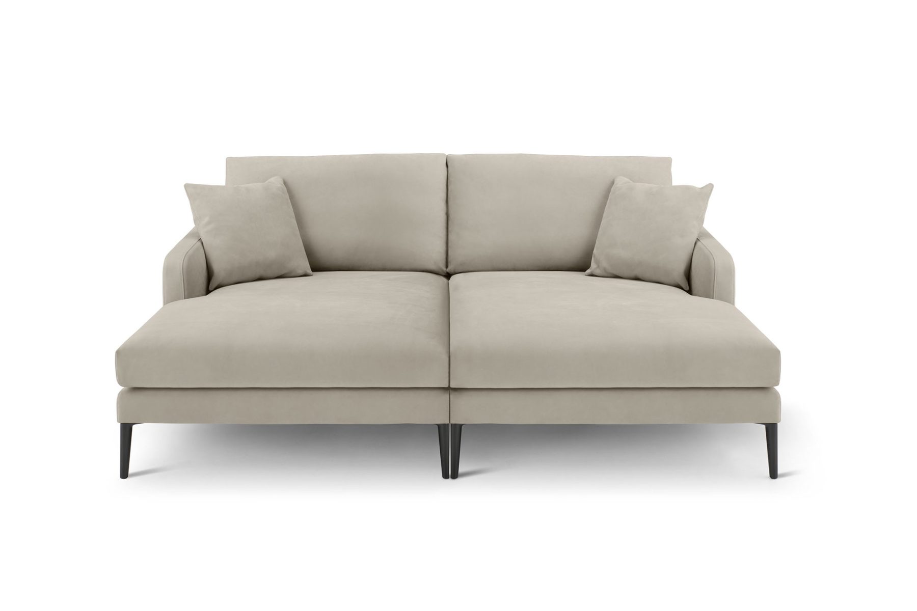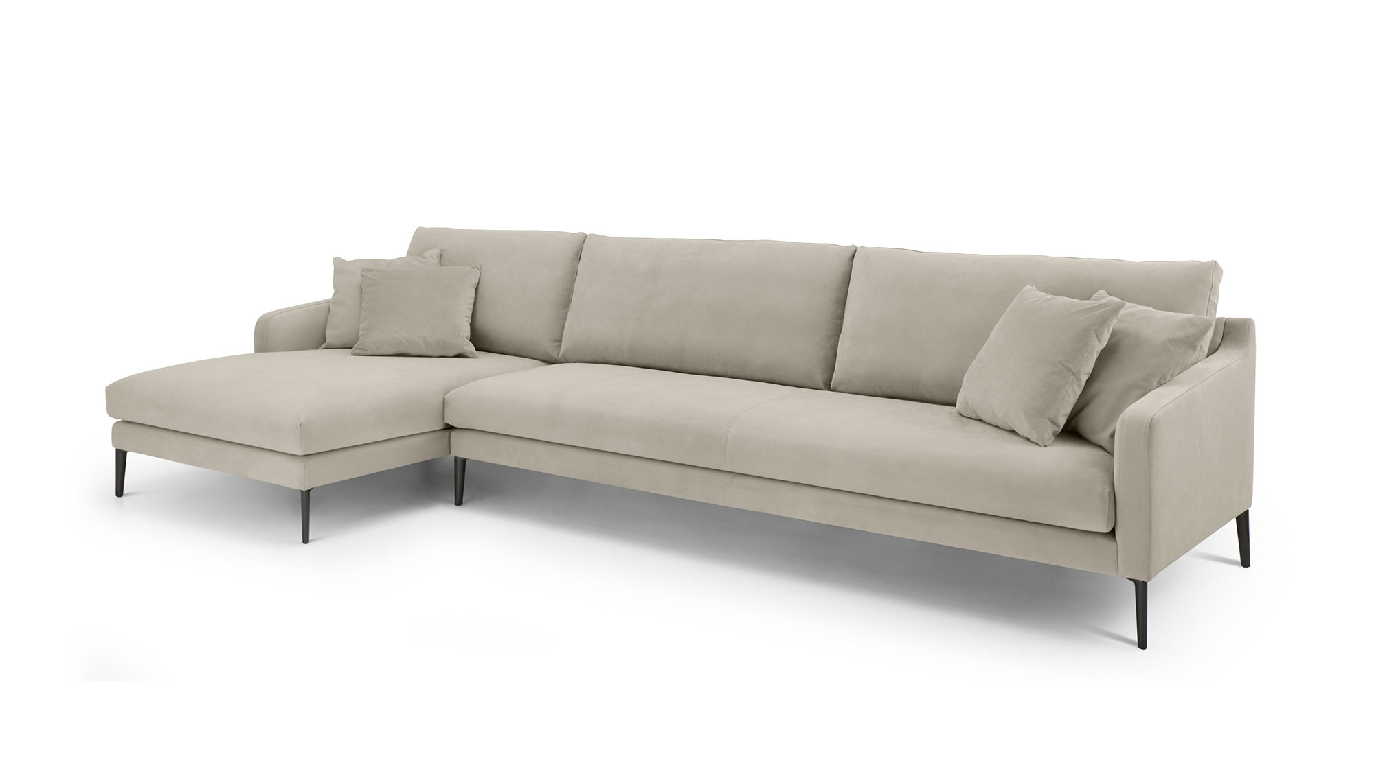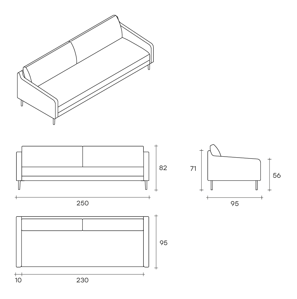 Divano fisso o componibile con struttura interna in legno multistrato. Molleggio seduta con cinghie elastiche. Imbottitura dei cuscini seduta in poliuretano a densità variabile; imbottitura dei cuscini schienale in piuma d’oca lavata e sterilizzata.