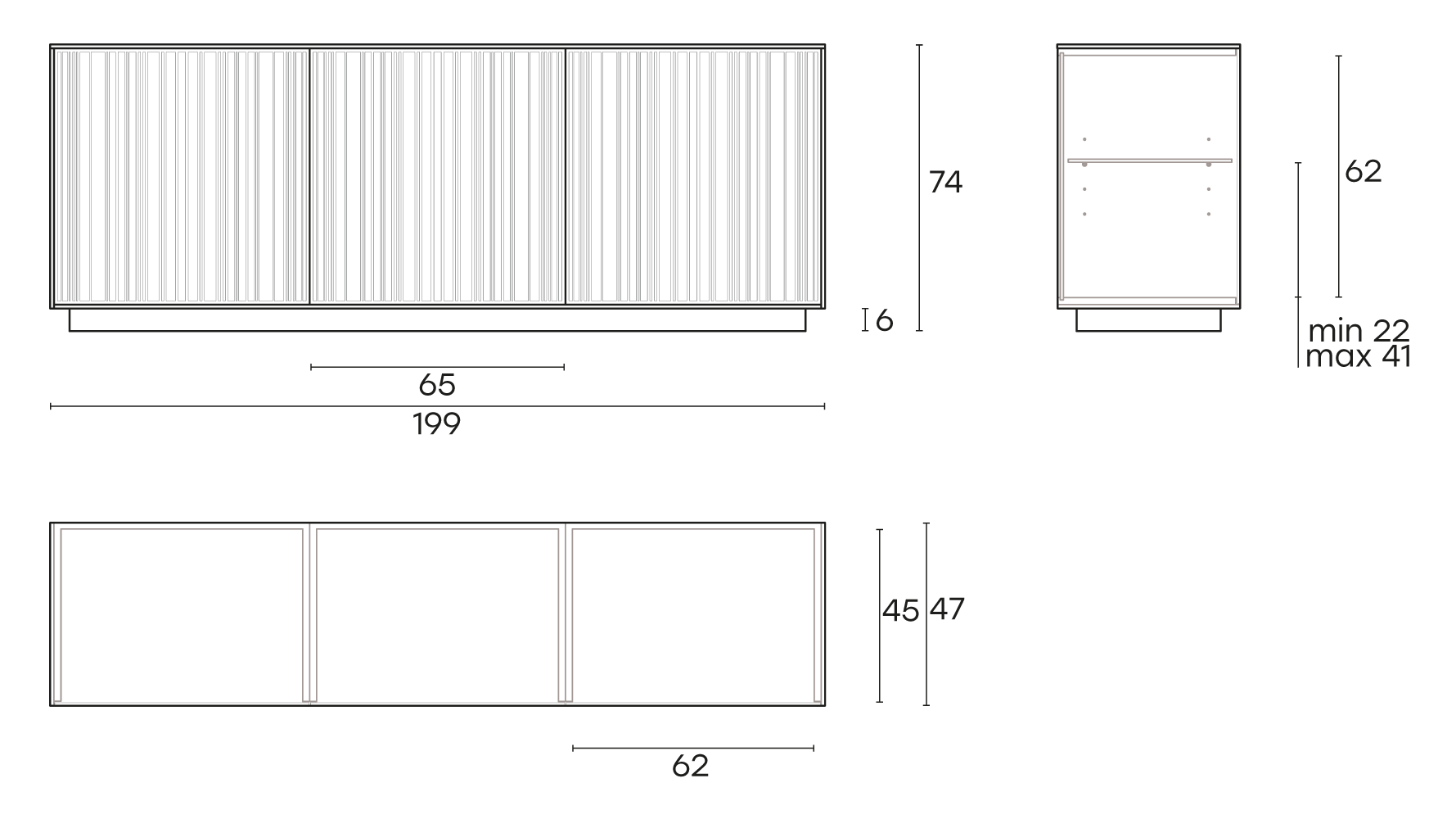 Madia con struttura in legno laccato bianco opaco, grigio vulcano, oppure Greige Metallizzato.