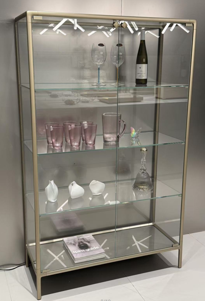 Vetrina con struttura in alluminio verniciato, disponibile nelle finiture Champagne Metallizzato, Greige Metallizzato e Grigio Vulcano.