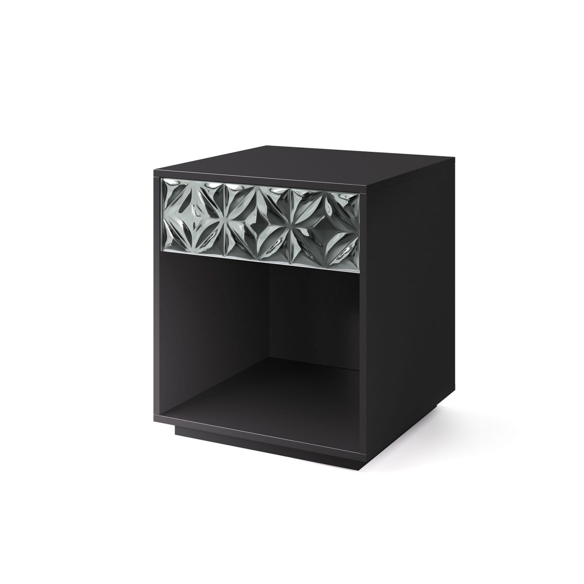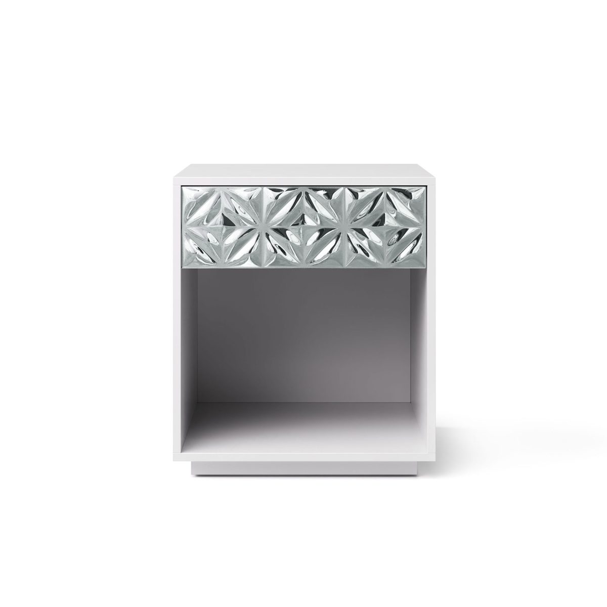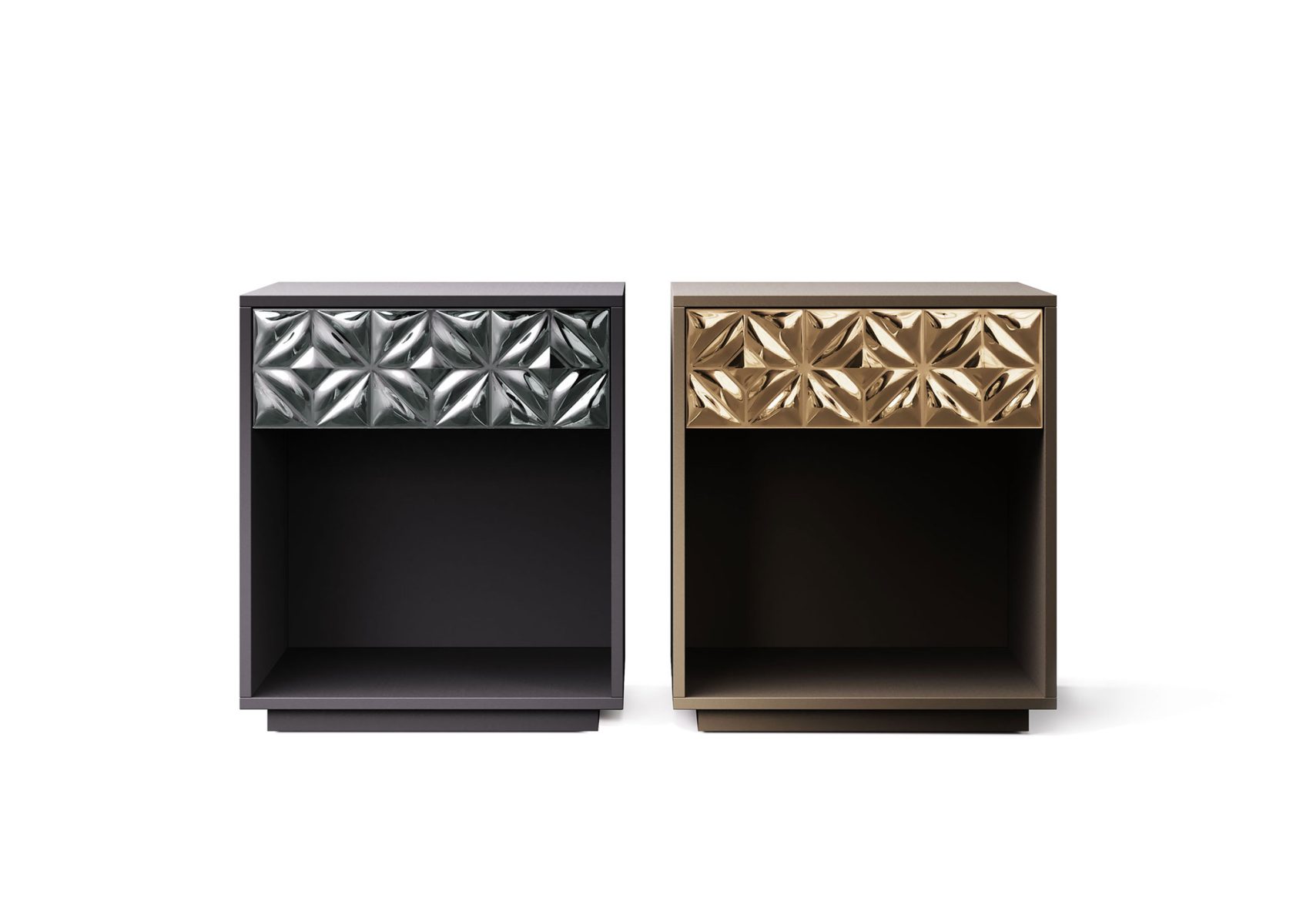 Comodino con struttura in legno laccato bianco opaco, grigio vulcano, oppure Greige Metallizzato.