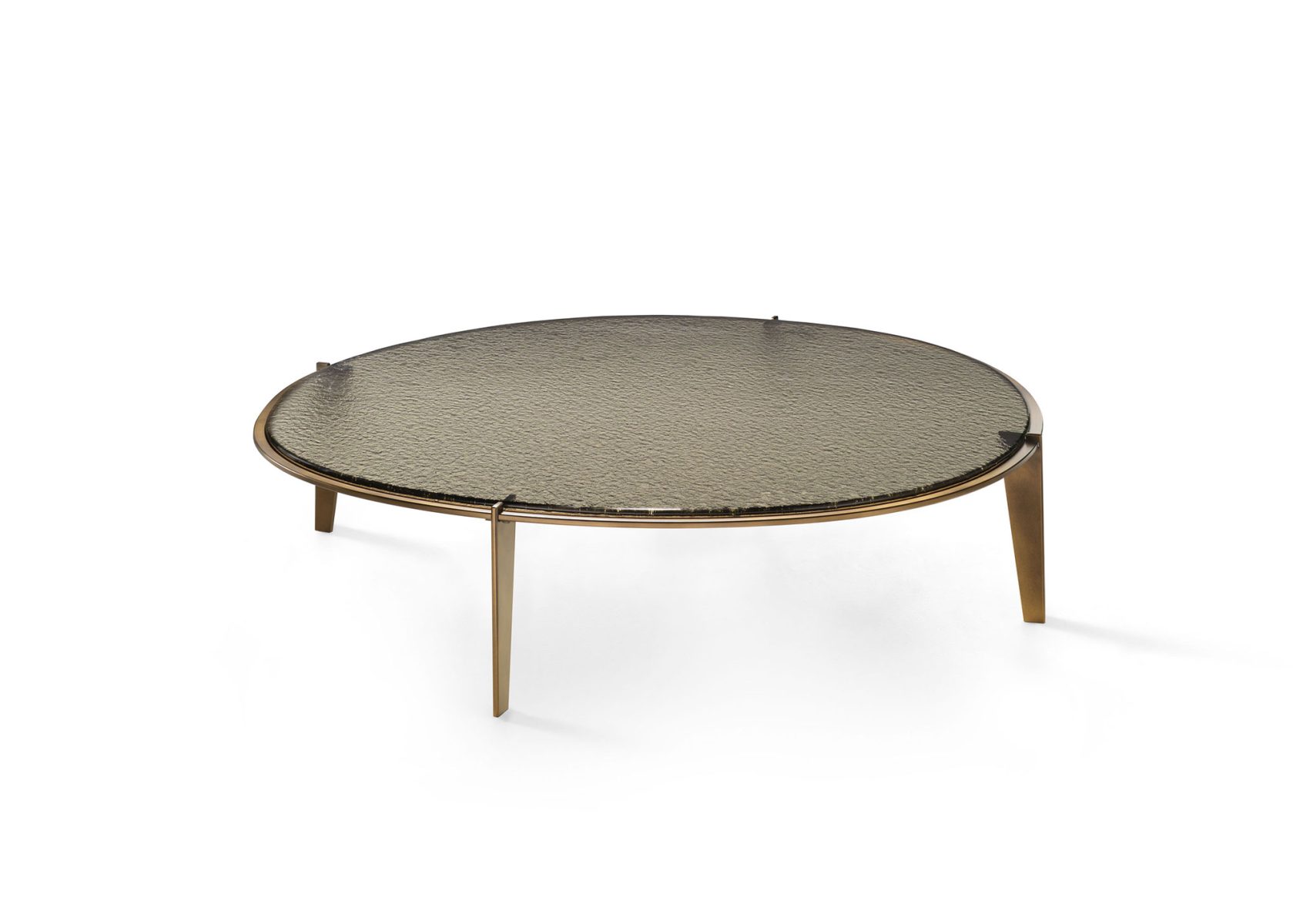 Tavolino con piano in vetro da 10 mm fuso a gran fuoco e temperato, disponibile fumè o bronzo.