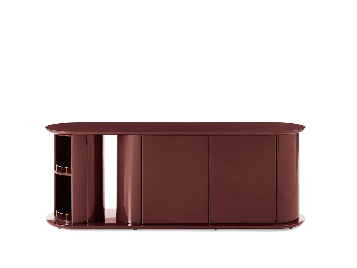 Contenitore con struttura, ripiani, ante e mezzo-cilindro girevole in legno laccato lucido o opaco. Colori disponibili: “Rosso Persia”, “Grigio Londra”, “Nero Giza”, "Bianco Camargue", "Verde Provenza", "Blu Pacifico", "Bordeaux Etruria", "Rosa Jaipur" e "Sabbia del Nilo". Dettagli in ottone satinato. Contenitore con anta push and pull con ripiano interno in legno laccato nella stessa finitura. Su richiesta versione con apertura anta bifacciale.