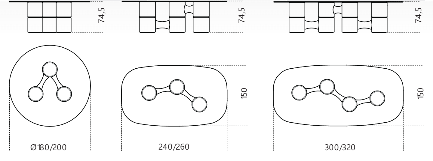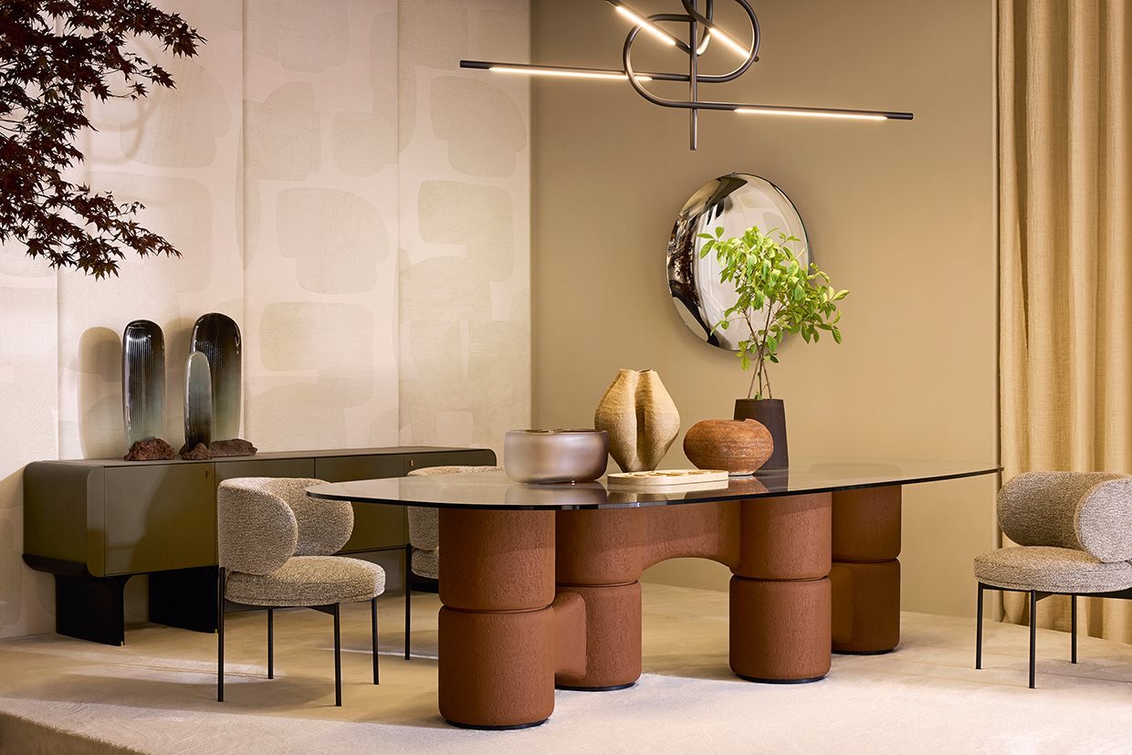 Tavolo con piano in cristallo trasparente temperato 15mm. Base formata da cilindri in legno spatolati a mano. Disponibile nei colori mattone, corda, carbone o avorio.