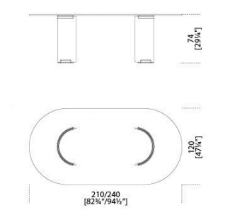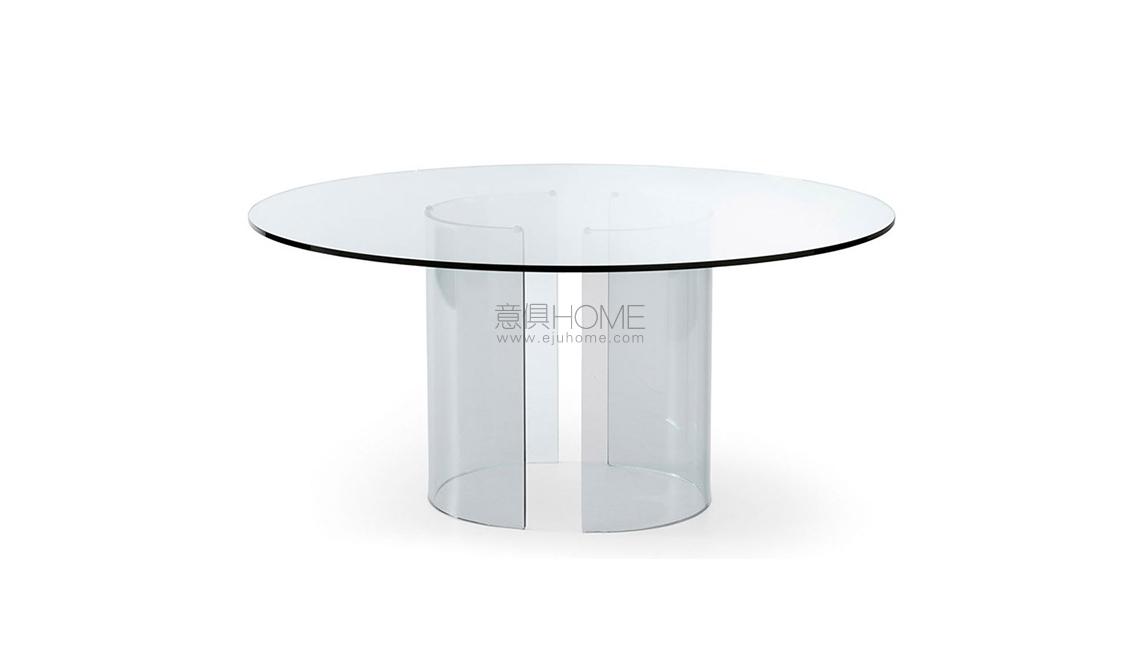 Table in transparent glass. Bases in 15mm thick glass curved by fire and hand bevelled. Chromed brass clips. Available also without metal parts (total height: 72cm). Customized sizes for the top on request. For glass top larger than 260cm, four bases are recommended.