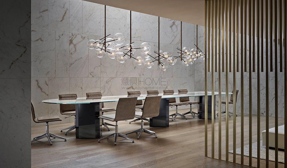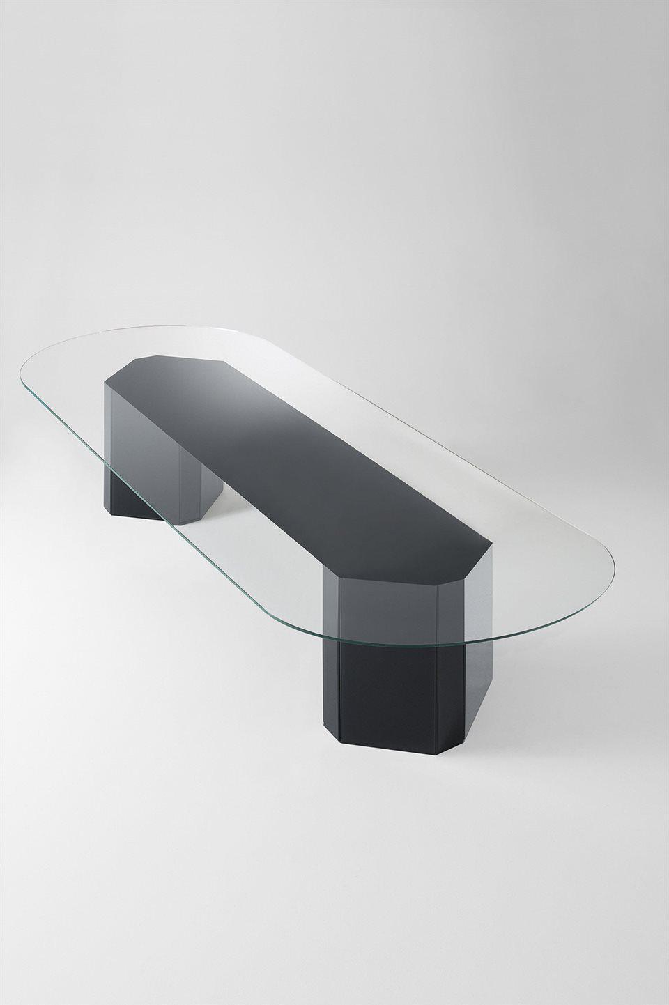 Table with 15mm extralight transparent glass top, Painted only in the middle part, as per samples in the bright version. Wooden base covered by painted glass. Available with cable management, on request. Akim is suitable for modular compositions also in customized sizes (Akim System).