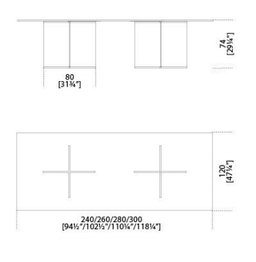 Chromed brass metal parts. 15mm tempered glass base. Customized sizes for the topon request. Top thickenss 15mm or 19mm. Available with transparent glass top or transparent extralight glass top. For glass top larger than 240cm, two bases are recommended.