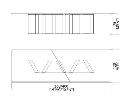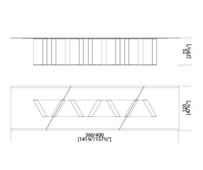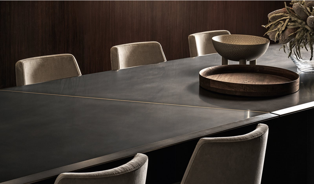 Table with 15mm modular glass top decorated by hand with an exclusive finish antique bronze/ lead. Large bevel of 4cms on the two sides. Wooden base covered by 6mm glass. “Supermirror”bright stainless steel bottom plate. Available also with bright or satin black painted glass top and with base covered by 20mm Sahara Noir marble.