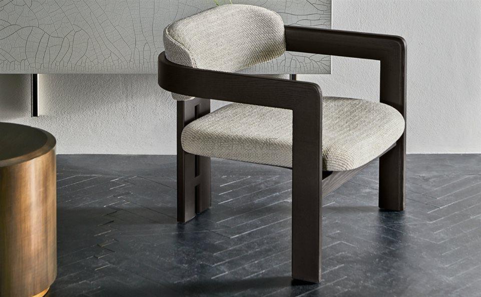 Armchair with black (mod. Layer) lacquered open pore ash structure. Available also in natural ash, tobacco stained or white open pore lacquered ash. Seat and backrest covered by fabric or leather.