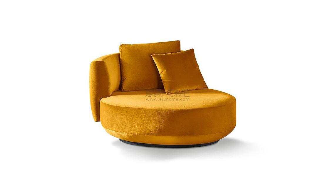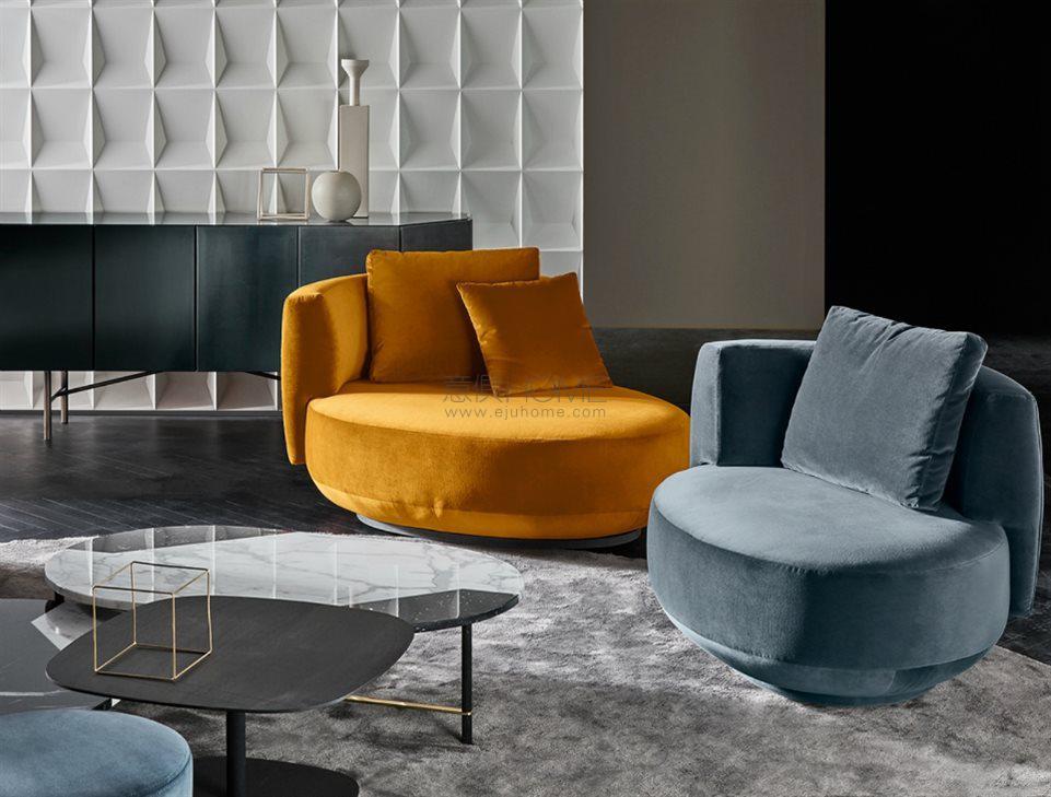 Swivel armchair in nondeformable foam polyurethane in different densities and polyester fibre with wooden inside structure. A polyester fibre back cushion included. Available covered by fabric or leather as per sample. Decorative polyester fibre cushion, on request.
