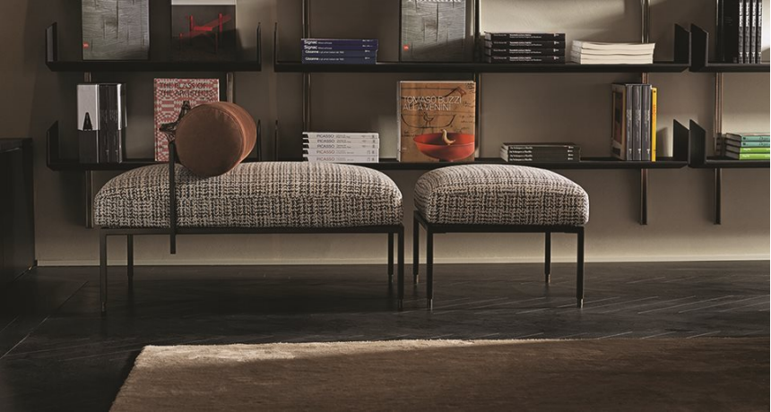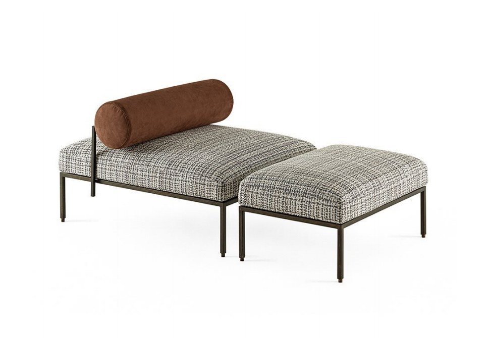Bench and pouffe with hand burnished brass structure. Seat cushion in non-deformable foam polyurethane in different density and polyester fibre and back rollcushion covered by fabric or leather as per samples. Decorative cushion on request.