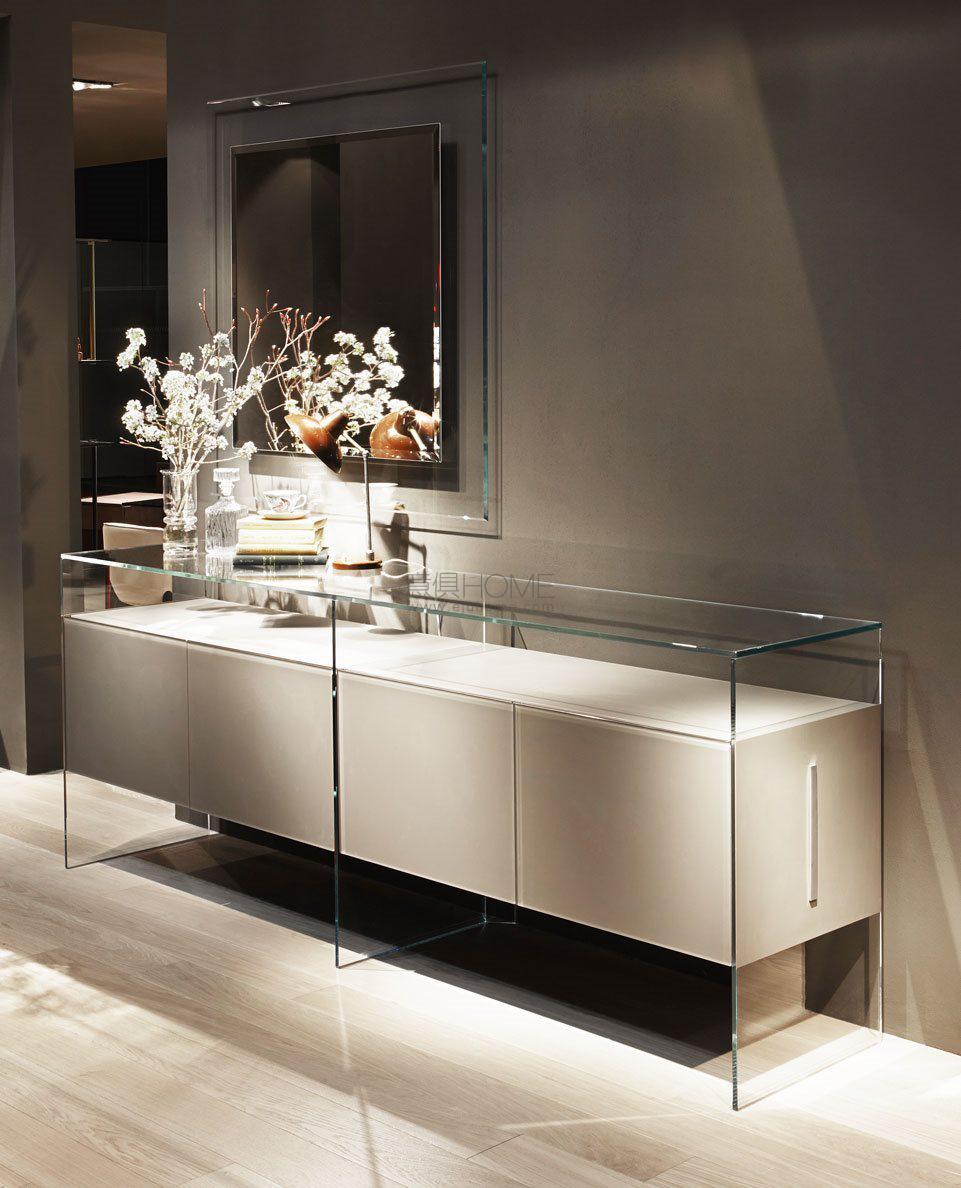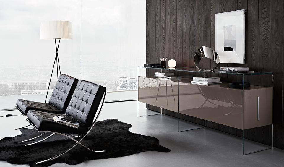Modular system of wooden elements covered by painted glass as per samples in the bright or satin version or in extralight mirror. Smoked "grigio Italia" mirror for suspended version and for the units U06, U06R only. Available as freestanding version with 12mm tempered extralight transparent glass side or suspended version. For compositions as a room divider is available a painted glass back. Bright anodised aluminium metal parts. The inside of Air Unit is made of leather effect laminated wood.