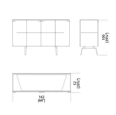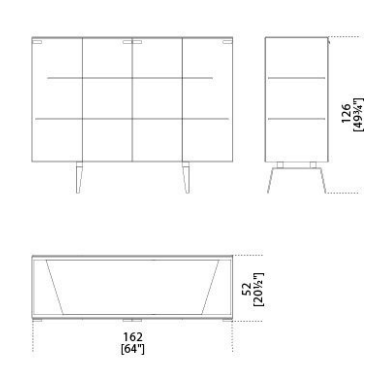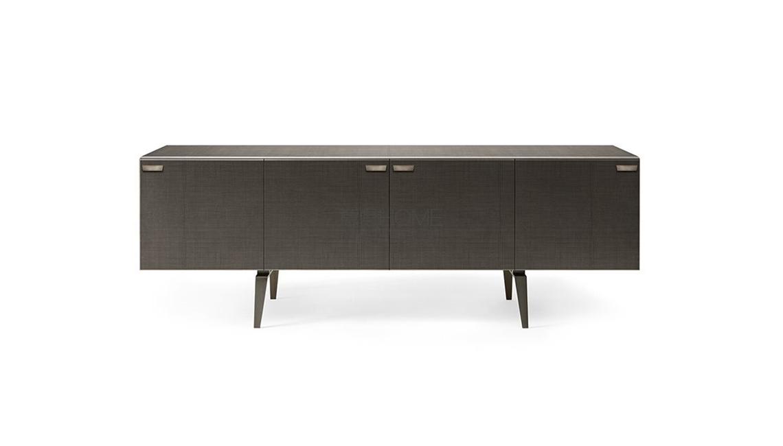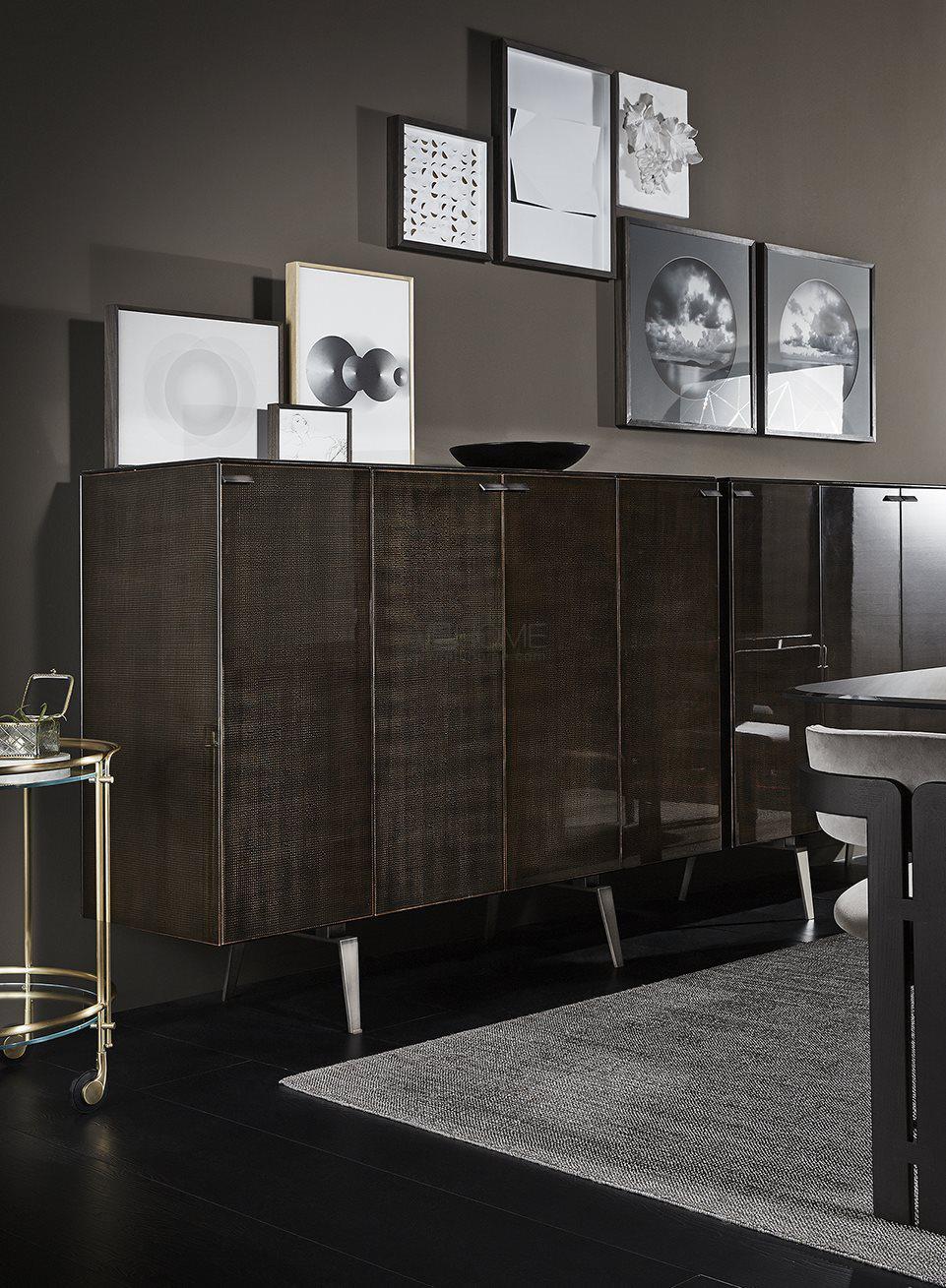 Sideboard in 8mm tempered glass decorated by hand with an exclusive treatment. Bright black painted inside. Patinated bronze lacquered metal structure and wooden base. Collection in numbered edition.