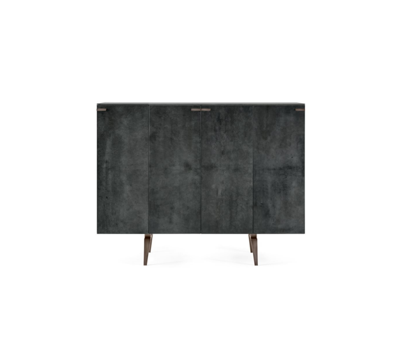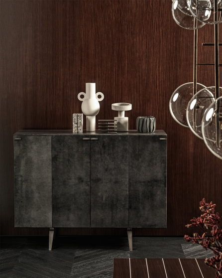 Sideboard in 8mm tempered glass covered by goat skin parchment. Due to the characteristic of the parchment each piece is unique and exclusive. Patinated bronze lacquered metal structure and wooden base. Collection in numbered edition.