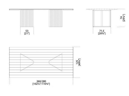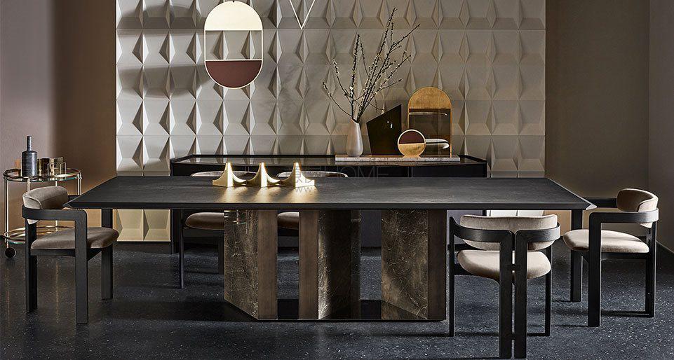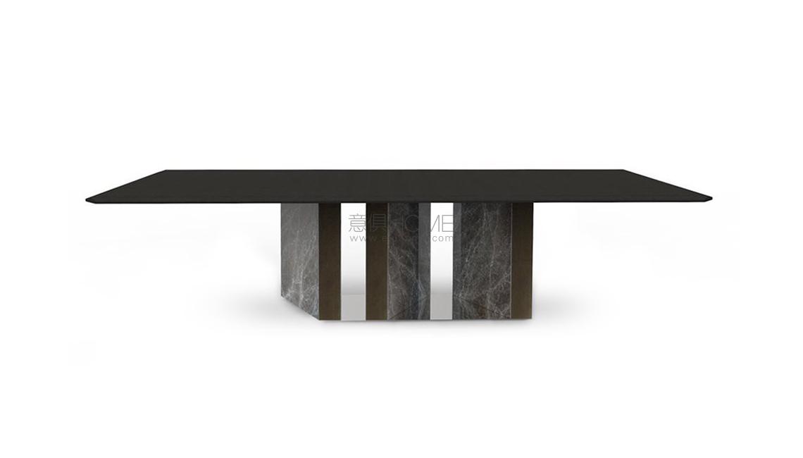 Table with black stained brushed ash top and Sahara Noir or Grey Stardust marble base. "Supermirror" bright stainless steel bottom plate.