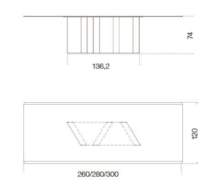 Table with 15mm black painted glass top, in the bright or satin version. Large bevel of 4cms on two sides. Sahara Noir marble base. “Supermirror” bright stainless steel bottom plate.