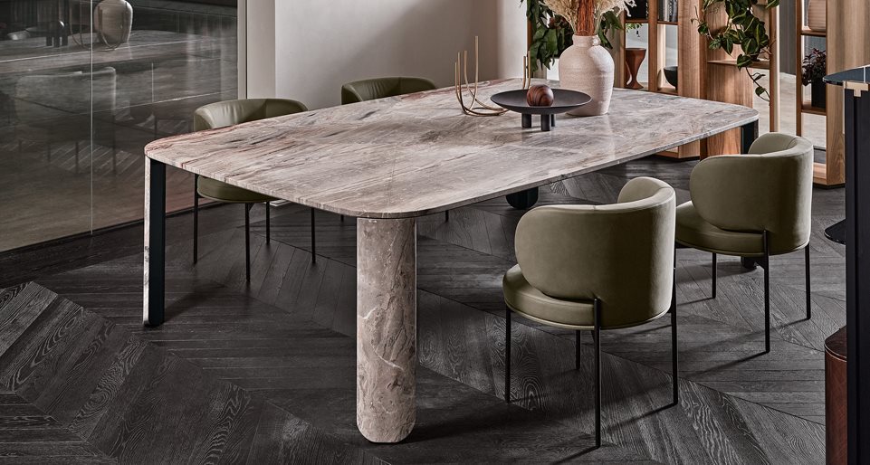 Tavolo in marmo 20mm Arabescato Orobico Rosso satinato, disponibile in Ceppo di Gré spazzolato oppure in marmo Bianco Carrara Gioia spazzolato. Dettagli in metallo brunito a mano “dark”.