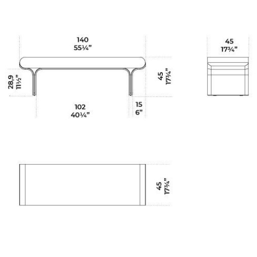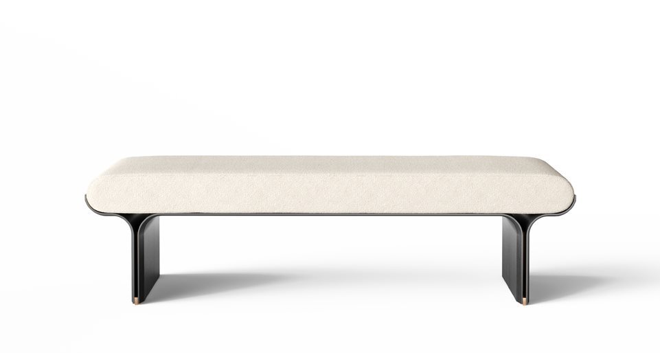 Panca con base in frassino curvato tinto nero poro aperto e dettagli in ottone lucido. Cuscino in poliuretano espanso rivestito in tessuto o pelle nei colori del campionario. Rivestimento sfoderabile.