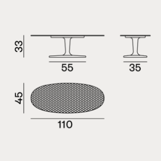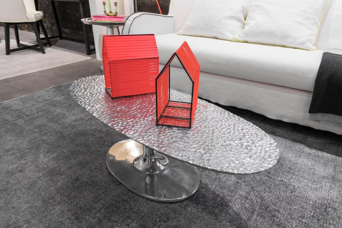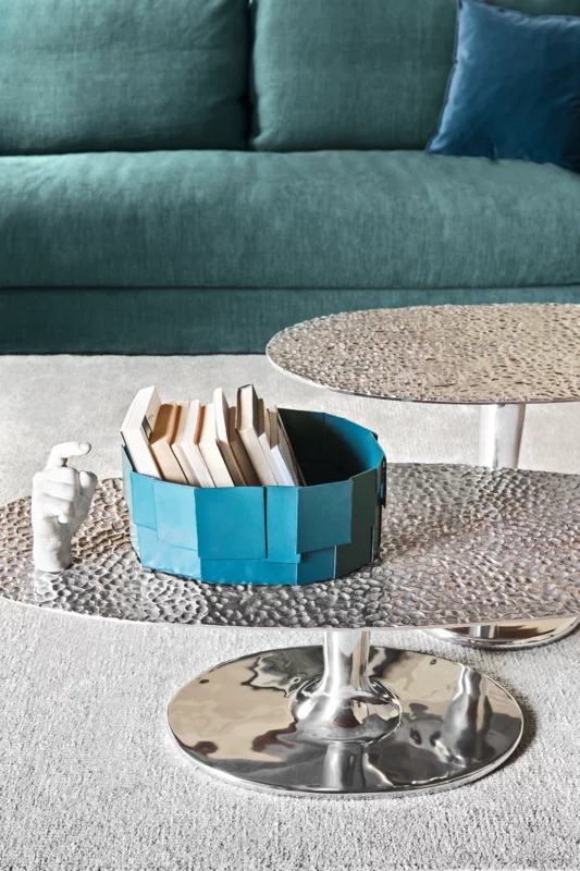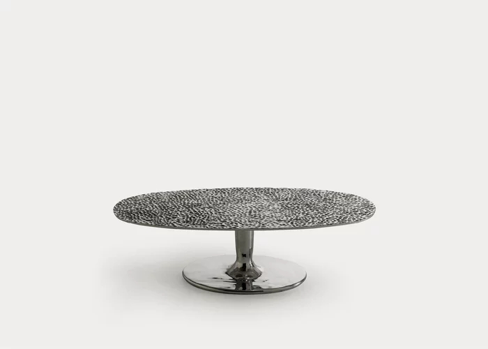 Giochi di luce e di riflessi caratterizzano la famiglia di tavolini Next 147/148. Realizzati interamente in fusione di alluminio lucidato, in diverse dimensioni e altezze, sono caratterizzate da una singola base centrale che si unisce ad un piano ovale impreziosito e decorato da un effetto martellato. La lucidità della superfice permette alla luce ci creare effetti ogni volta diversi.