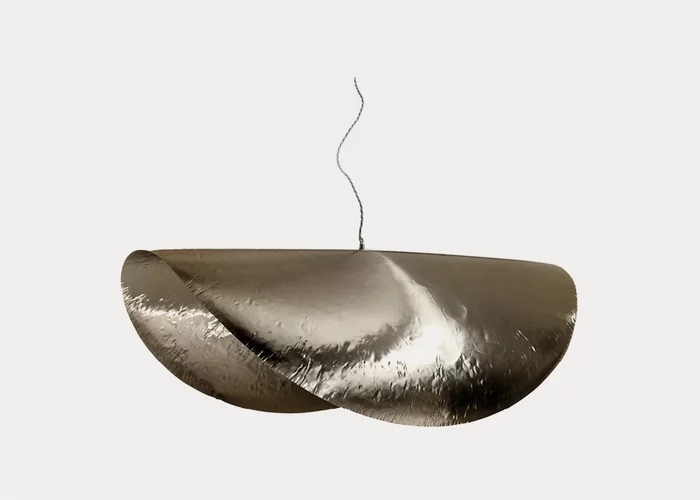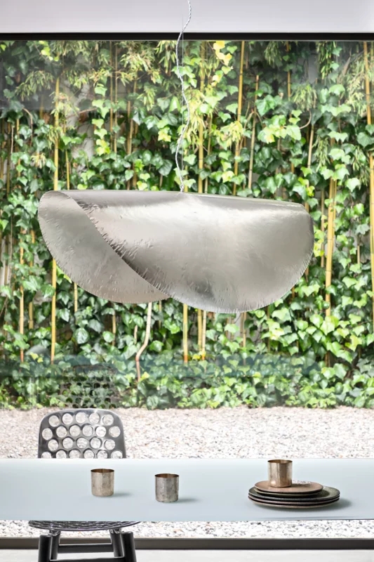 Una famiglia di lampade a sospensione dal linguaggio raffinato e contemporaneo, realizzate a partire da un disco di lamina sottile in ottone finitura nichelato dai riflessi lunari, disponibile con curvatura delicata nella versione più piccola o molto accentuata in quella più grande. Grazie al suo disegno leggero sembra fluttuare nell’aria avvolgendo delicatamente la sorgente luminosa. Possono essere utilizzate singolarmente o abbinate tra di loro per un effetto ancora più suggestivo e scenografico.