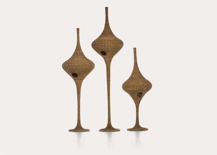 Linee sinuose che ricordano l'avvolgente forma di un nido caratterizzano la famiglia di lampade da terra SPIN S/M/L, disponibili in 3 diverse dimensioni. La struttura avvolgente che ricorda il fuso dell’arcolaio, è realizzata interamente in midollino intrecciato naturale, laccato bianco opaco, grigio, oceano, tortora o nero. è un prodotto in grado di creare un’atmosfera calda ed accogliente grazie alla luce che viene filtrata dall’intreccio in fibra naturale.