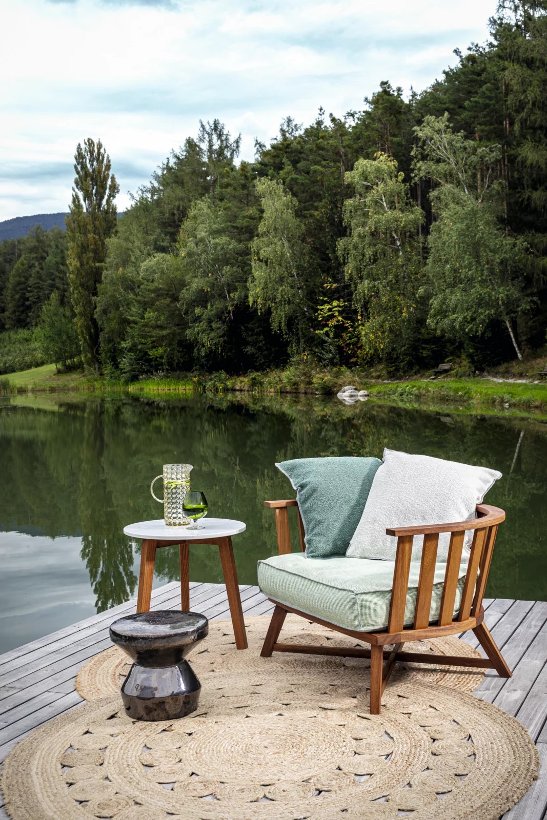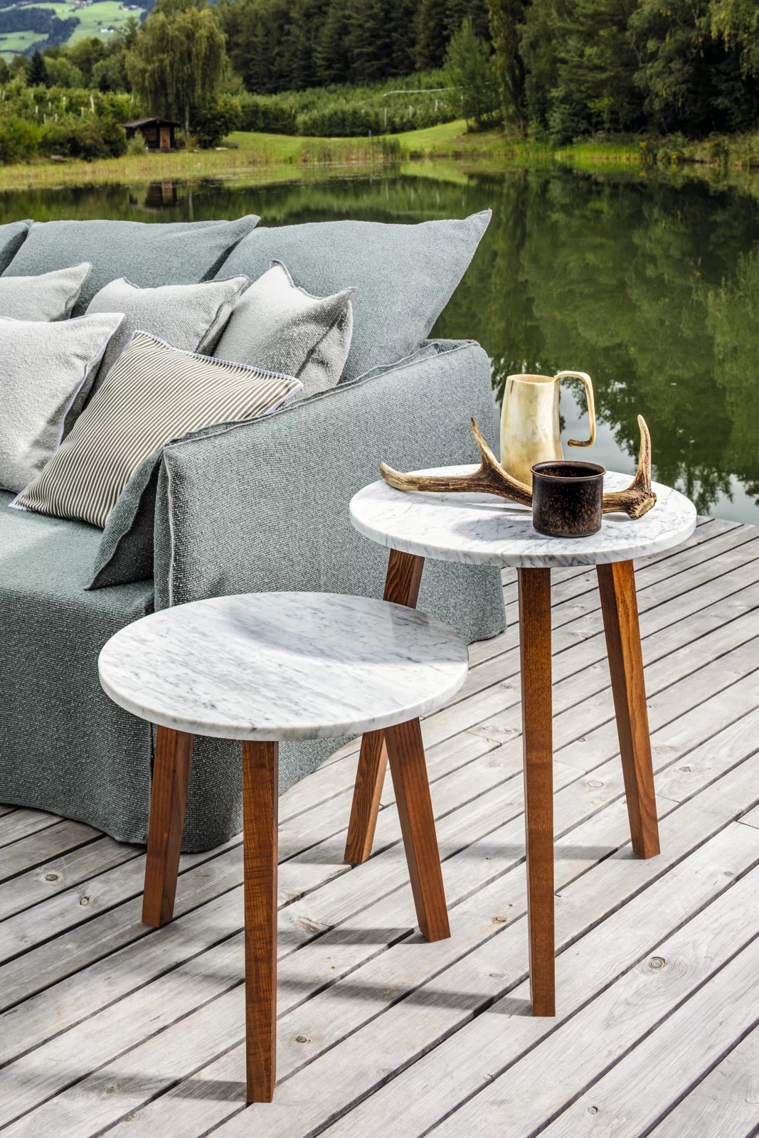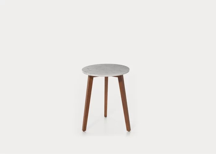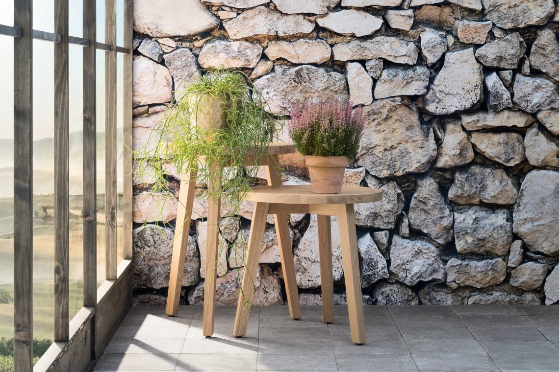 Famiglia di tavolini dallo stile classico, Inout 742/744 sono dei tavolini a tre gambe con piano rotondo: le gambe sono realizzate in Iroko oliato, legno particolarmente duraturo perchè naturalmente resistente all’acqua e all’umidità, che si unisce al marmo bianco Carrara del top.