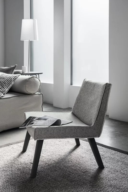 Materiali diversi a confronto per la poltroncina LC 24. Complemento d’arredo a completamento della zona notte ha una forma compatta e allo stesso tempo accogliente. Si caratterizza per piedini in noce Canaletto naturale, nero, bianco, grigio, oceano o tortora, ed un rivestimento sfoderabile in tessuto o ecopelle con cucitura taglia e cuci.