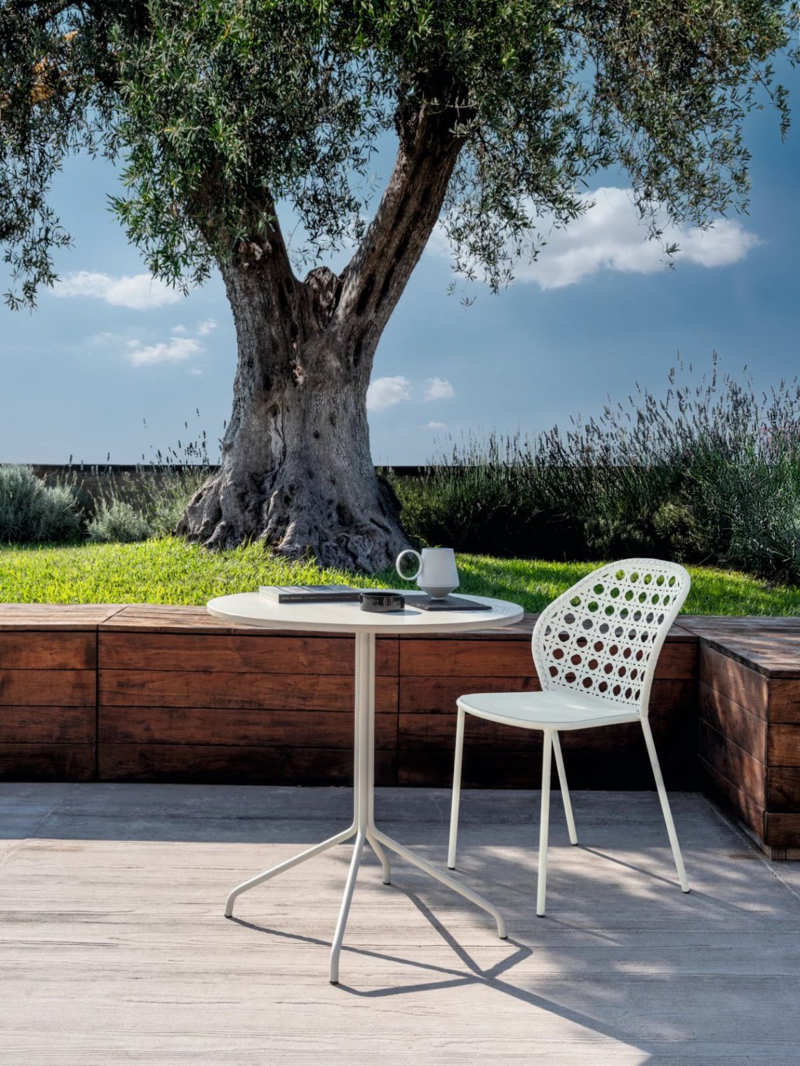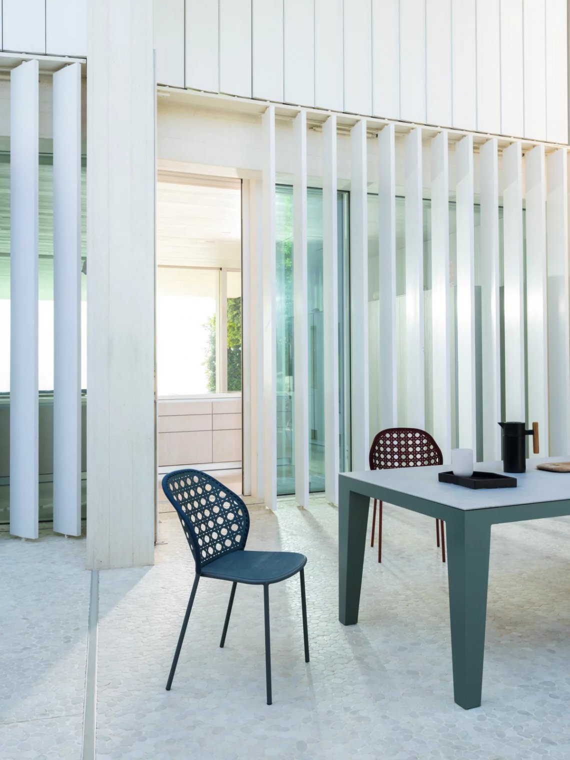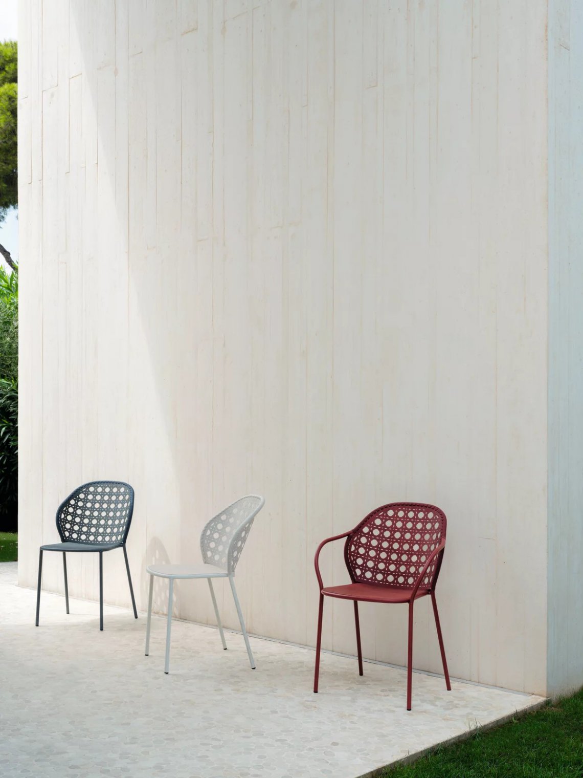 La libertà di comporre lo spazio intorno al tavolo all’aperto ispira la proposta di sedie Brise, in tubolare di acciaio inox con seduta e schienale in WoodEvolution. è proprio la lavorazione dello schienale in WoodEvolution intagliato a laser, ad identificare quella che è la peculiarità della collezione Brise: la creazione di una texture forata in rimando alla paglia di Vienna. Gli elementi degli schienali sono fissati alla struttura con una preziosa fettuccia nautica colore tono su tono.