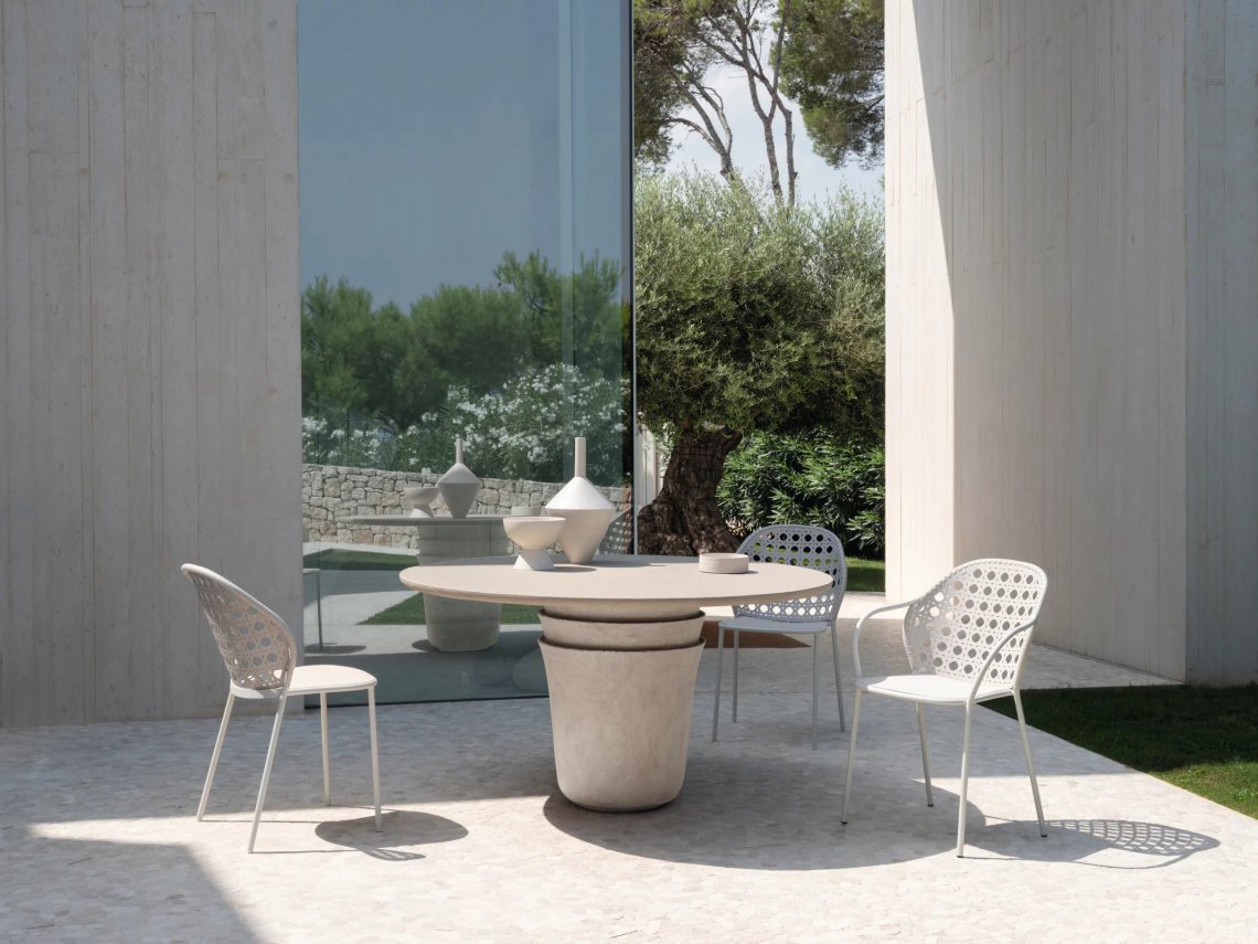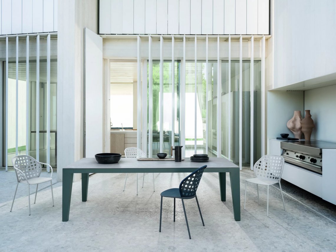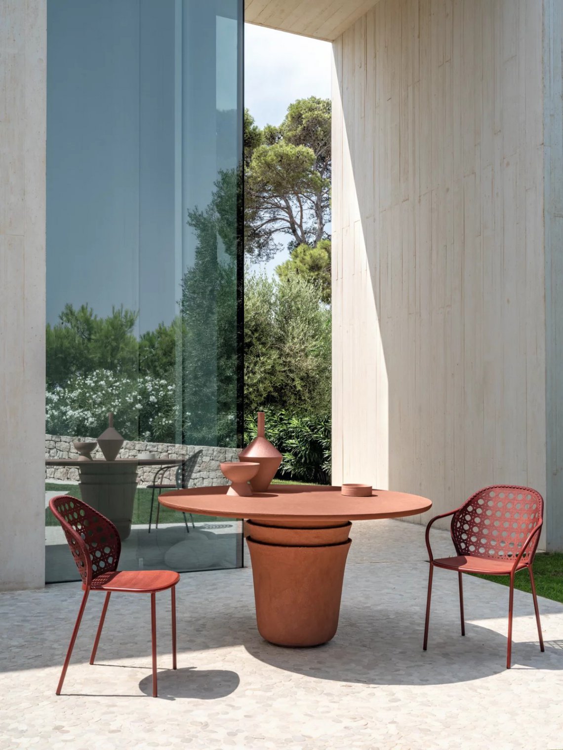La libertà di comporre lo spazio intorno al tavolo all’aperto ispira la proposta di sedie Brise, in tubolare di acciaio inox con seduta e schienale in WoodEvolution. è proprio la lavorazione dello schienale in WoodEvolution intagliato a laser, ad identificare quella che è la peculiarità della collezione Brise: la creazione di una texture forata in rimando alla paglia di Vienna. Gli elementi degli schienali sono fissati alla struttura con una preziosa fettuccia nautica colore tono su tono.