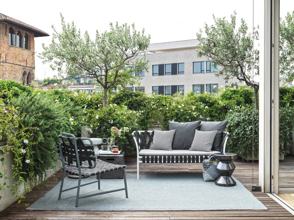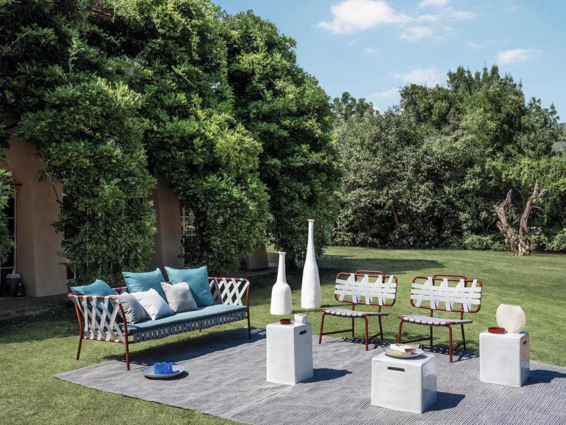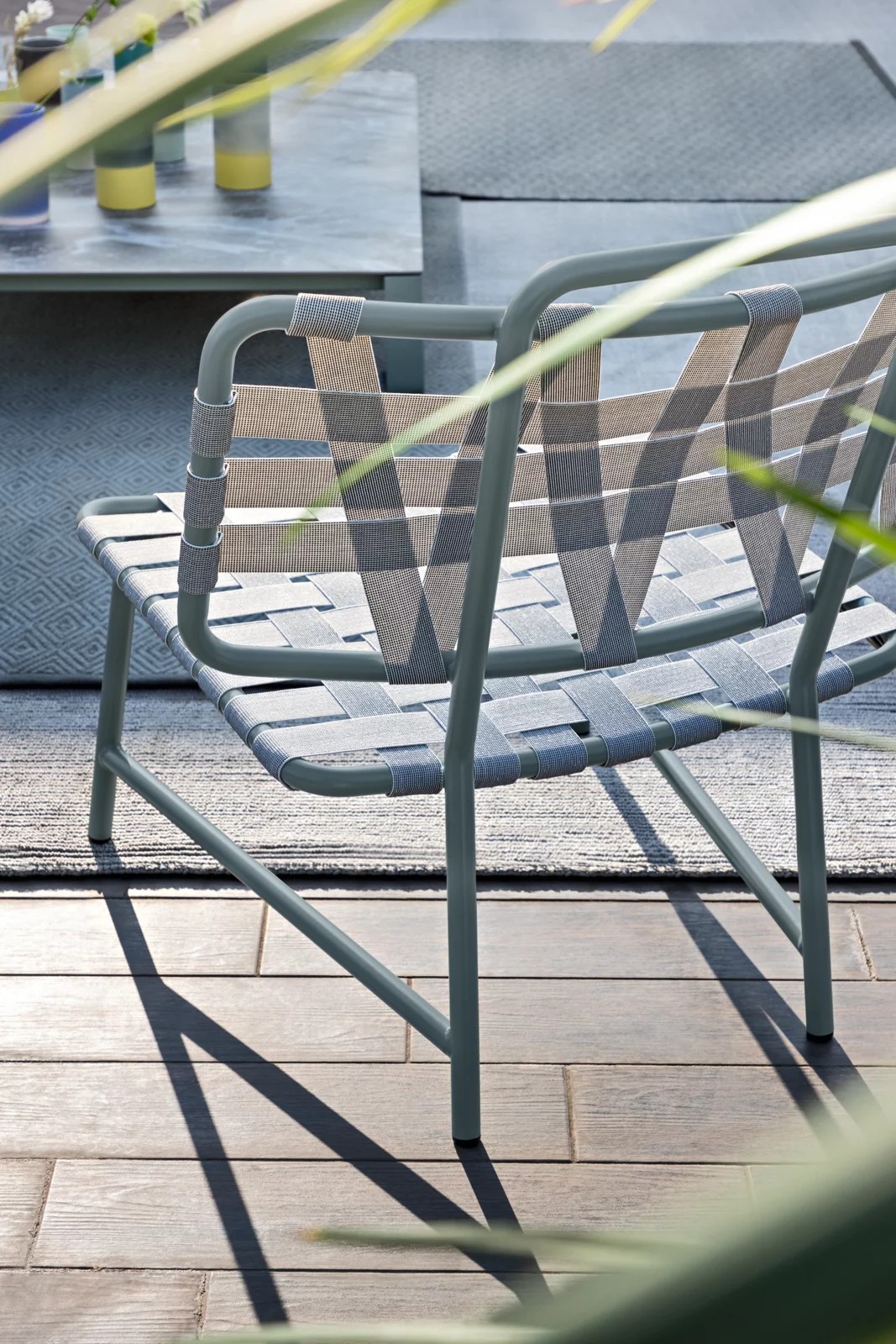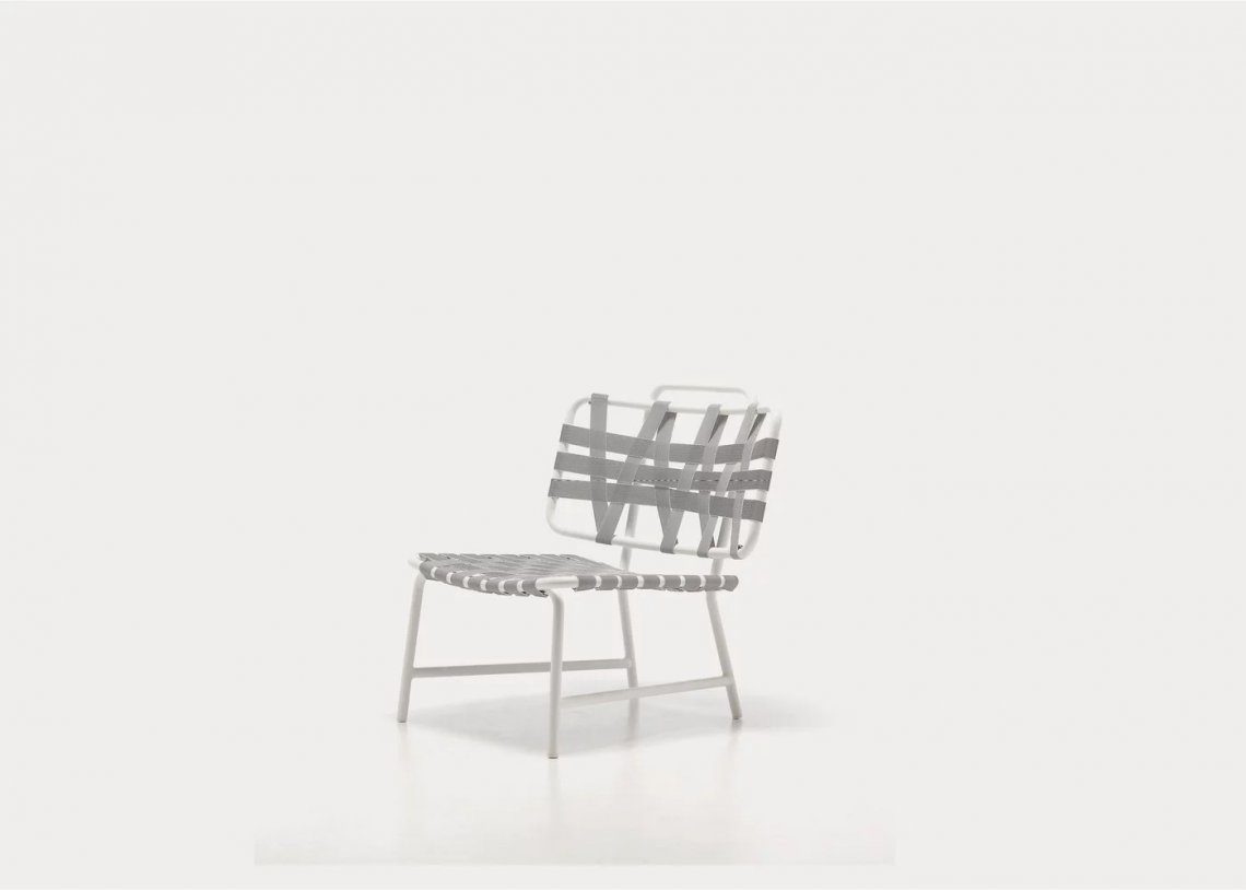 Definita da un’ampia seduta con schienale leggermente curvato per un arredo avvolgente, la sedia lounge Inout 856 si sviluppa attorno ad una leggera struttura in tubolare di alluminio verniciato goffrato nei colori Pearl, Oxido, Agate o Slate, materiale ecologico ed unico per qualità tecniche. A questo si aggiunge un particolare intreccio in cinghia elastica grigia, nera, blu o tabacco, un prodotto innovativo a base di gomma sintetica e propilene.