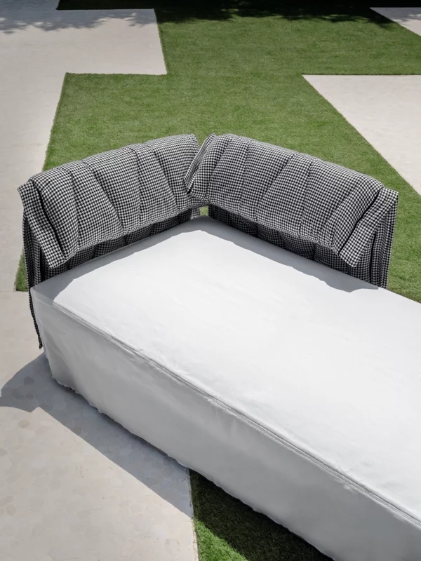 divano componibile outdoor Flair si caratterizza per lo schienale con doppia cerniera ribaltabile manualmente, indipendente per ogni singolo posto e rivestito con un tessuto trapuntato outdoor con dettaglio cucitura taglia e cuci tono su tono o a contrasto. è questo particolare a definire e movimentare lo skyline del prodotto, permettendo di avere doppie altezze sui singoli schienali. La struttura del divano in acciaio trattato per esterni si combina alla morbidezza dei cuscini di seduta in poliuretano espanso a densità variabile e fibre poliestere, rivestiti con telina poliestere outdoor e fondo traspirante antiscivolo.