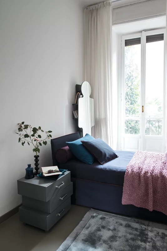 Specchio e mobile, LC 97 unisce due funzionalità diverse in un solo prodotto. Un progetto dal carattere forte in cui uno specchio a terra, che rappresenta una sagoma umana, integra e al tempo stessa cela un sistema a ripiani in noce canaletto naturale, nero, bianco o grigio, oceano o tortora. Disponibile anche senza sistema di ripiani (LC 197).