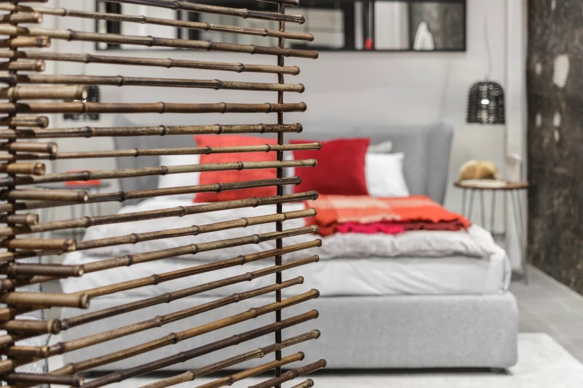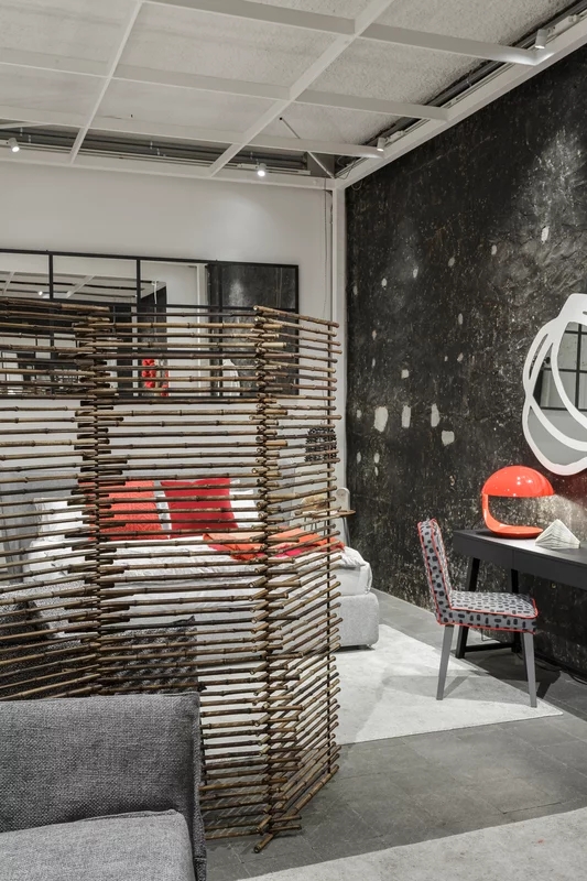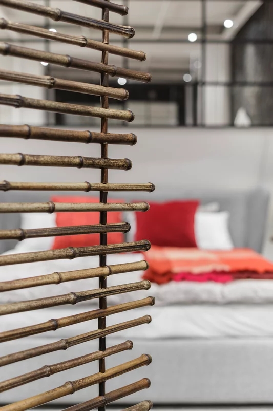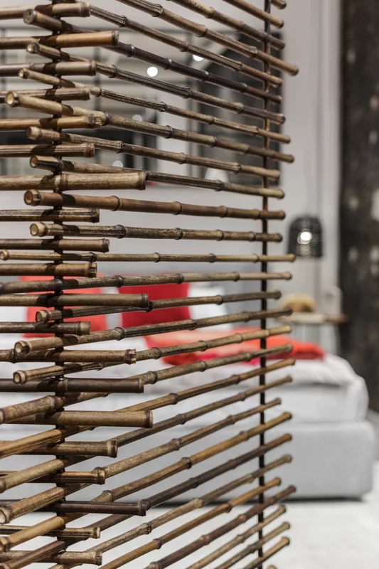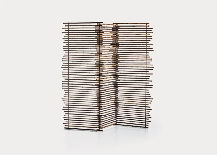 Paravento a tre ante dalla chiusura a libro, Black 90 esalta la naturalezza del black bamboo: canne fini di lunghezze differenti sono sovrapposte ad incastro per conferire dinamicità al prodotto. Un gioco di pieni e di vuoti e di vedo/non vedo reso possibile grazie alle linee di fuga tra una canna e l’altra che permettono alla vista di andare oltre.