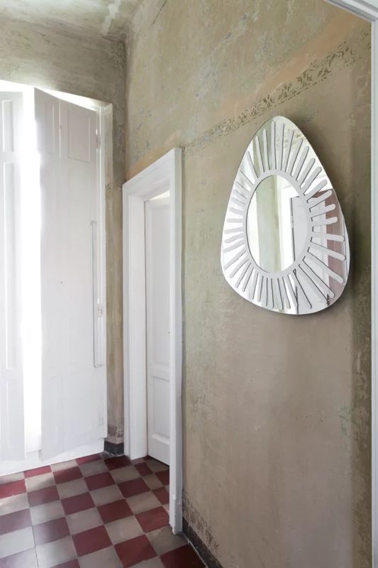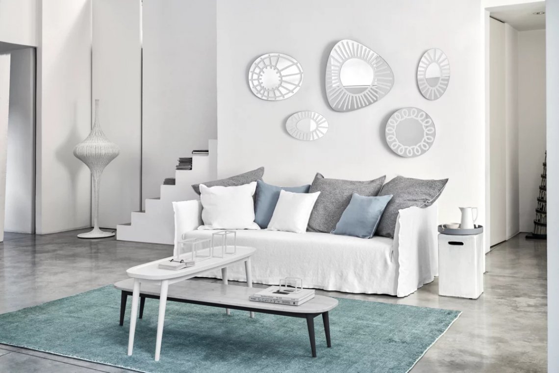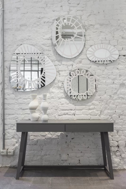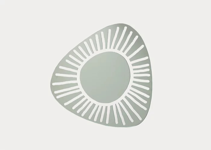 Famiglia di specchi a muro dalle forme irregolari arrotondate, BRICK 96-97-98-99 sono decorati da disegni in vernice bianca che sembrano ricreare pennellate realizzate a mano libera.