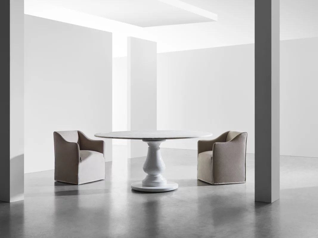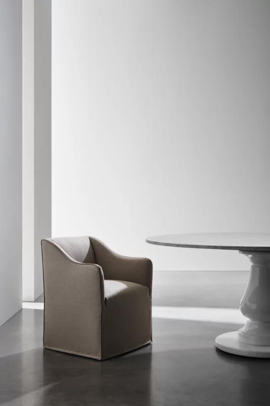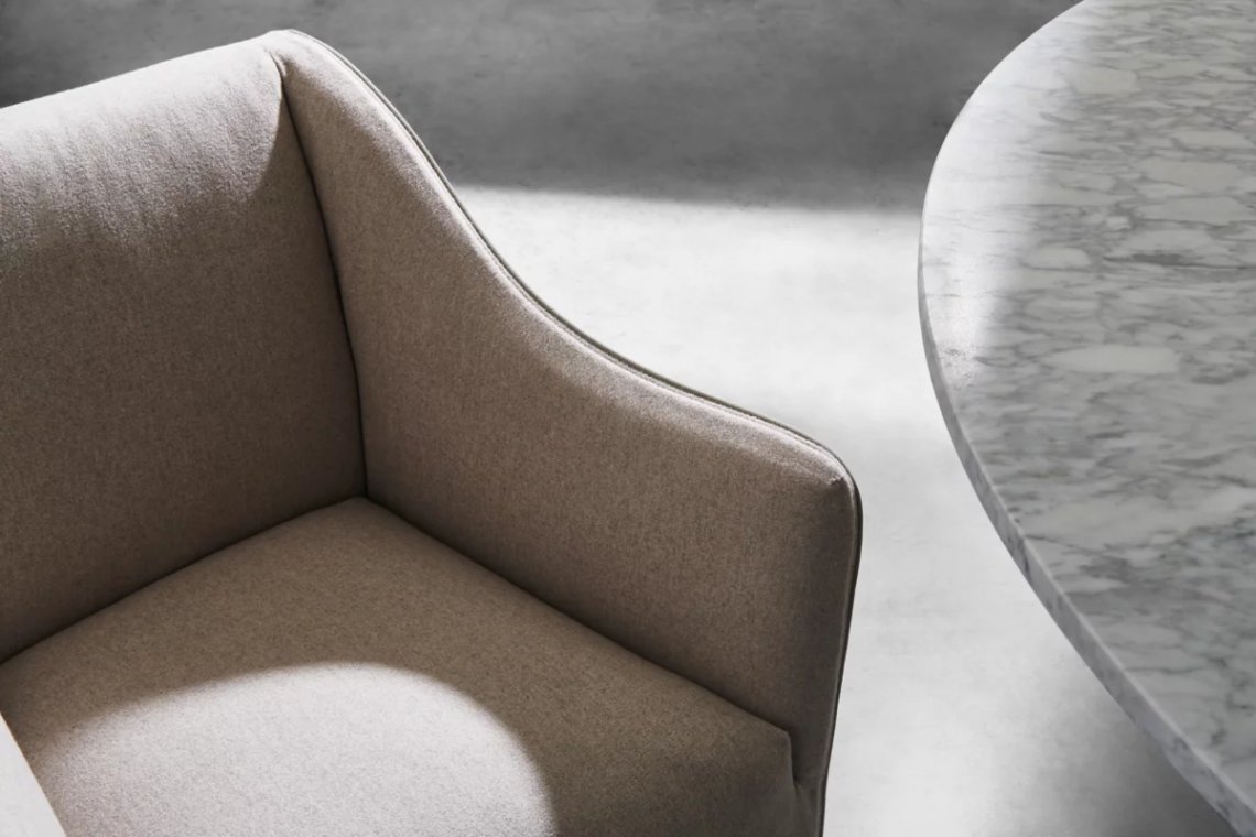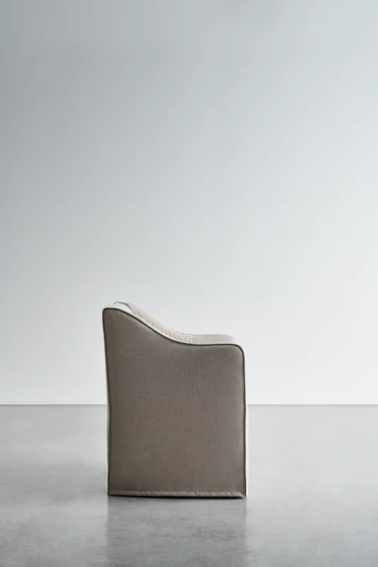 Poltroncina dining con imbottitura in poliuretano a densità differenziata. Rivestimento sfoderabile con piping. Disponibile in tutti i tessuti di campionario eccetto 3D, Quilt Malta, Nuage e Quilt Velour.
