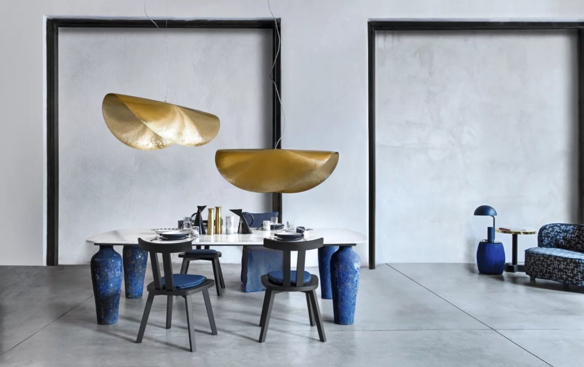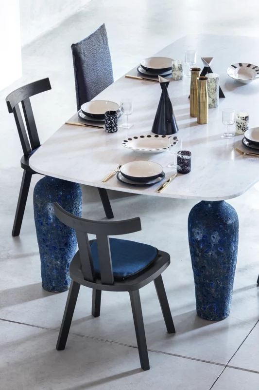 Un’audace combinazione di materiali contraddistingue la famiglia di tavoli Moon 32/33: la base in ceramica blu a forma di anfora, caratterizzata da una superficie materica irregolare ottenuta con una particolare finitura a mano, è abbinata ad un top rettangolare disponibile in due dimensioni in marmo bianco di Carrara.