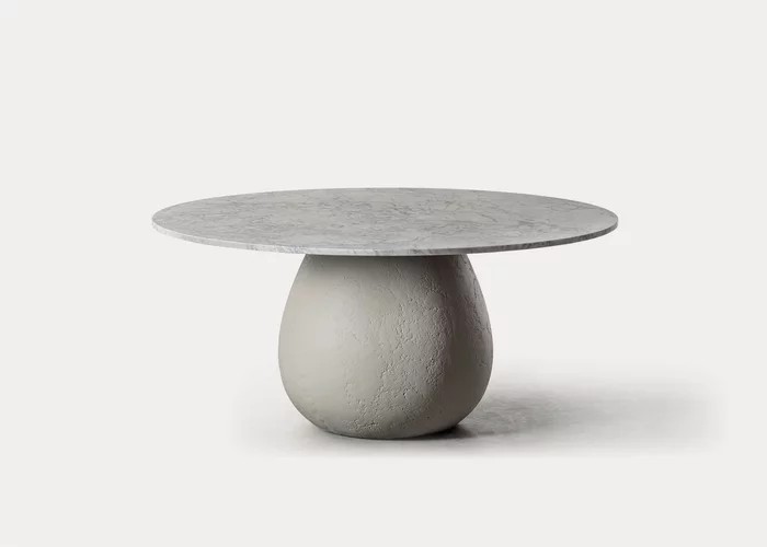 Volumi pieni e forme tondeggianti caratterizzano la famiglia di tavoli Next 232/236. Disponibili in due dimensioni risaltano grazie alla scultorea base centrale dalle forme piene, realizzata in cemento GFRC con finitura grigio opaco, il piano invece è in marmo bianco Carrara.