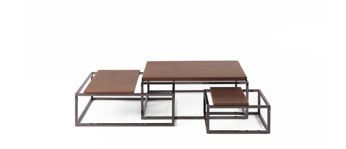 Moveable table tops in MDF, contoured with CNC technology, covered in L.09.02 cat. C Natural Saddle leather, with visible tone on tone stitching in nylon thread.