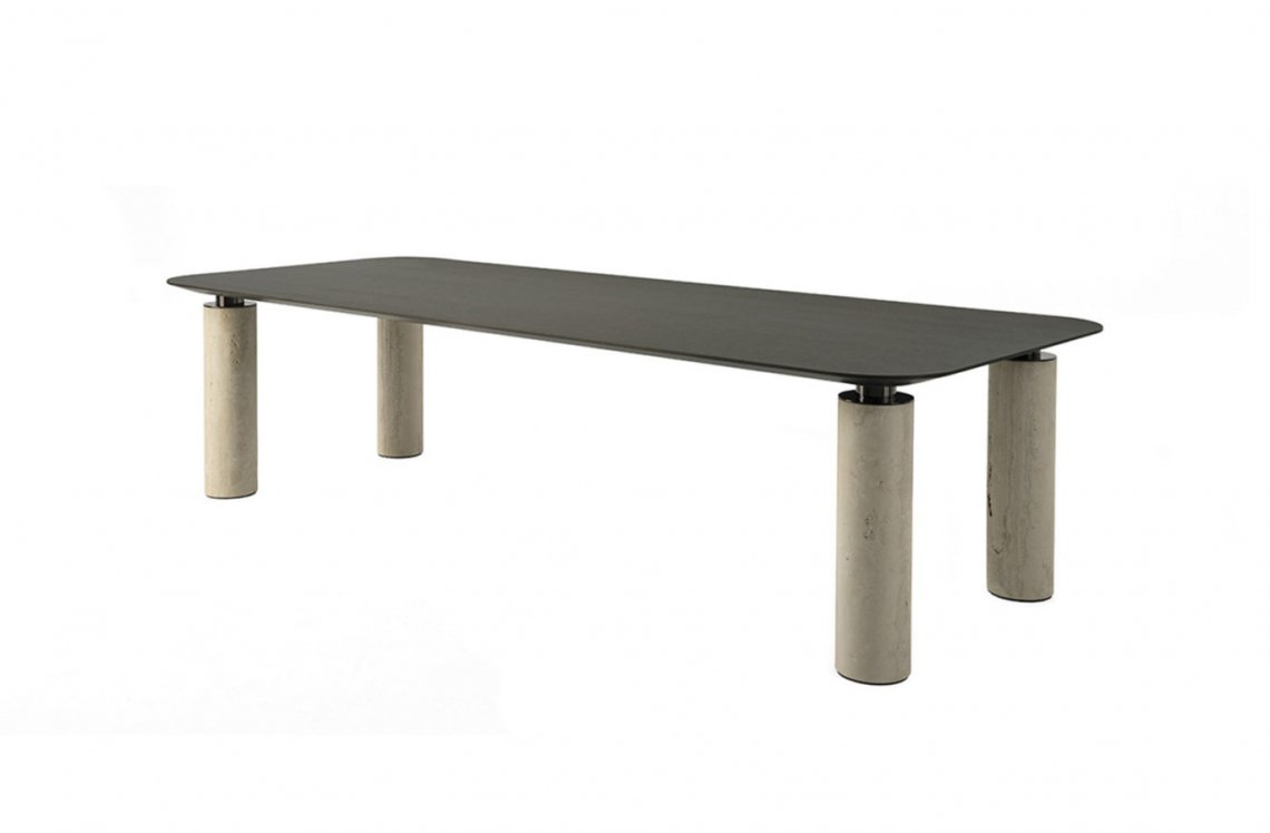 Rockefeller is an elegant dining table with a contemporary aesthetic. Its sculptural design is characterized by the contrast between solidity and lightness, stability and dynamism and light and dark shades. The robust appearance given by the thickness of the legs is counterbalanced by the delicacy and elegance of Travertino marble. The top with smoky grey finish - in contrast with the delicate tone of the legs - has a rounded shape, to give a sense of softness to the whole.