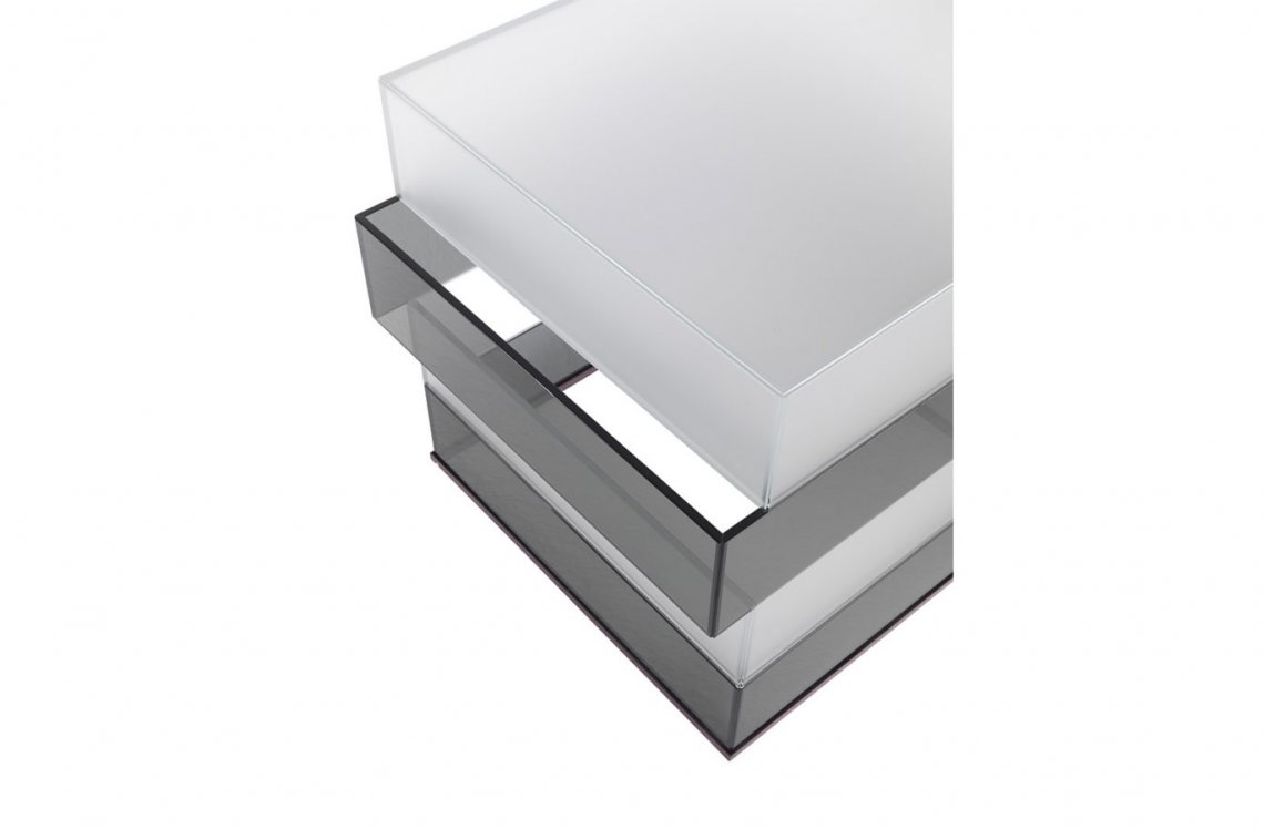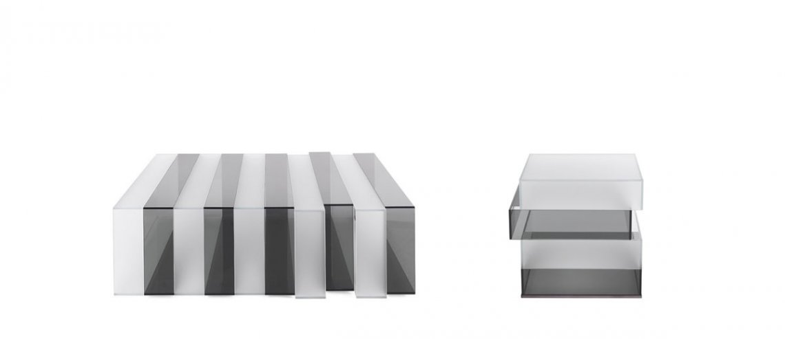 Pure volumes and essential lines: these are the main features of the Jenga low table. A composition with a refined design that is expressed in the succession of light and dark glass rectangles, assembled at 45° and joined without showing grafts or joints. The entire structure is made of glass and the whole piece is revealed to the eye as a unique light and refined block.