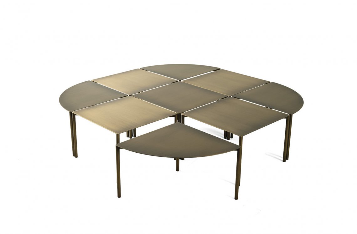 Modularity, essentiality and dynamism for the Times Square table. Consisting of nine combined elements, the table creates a game of fluid and harmonious shapes.