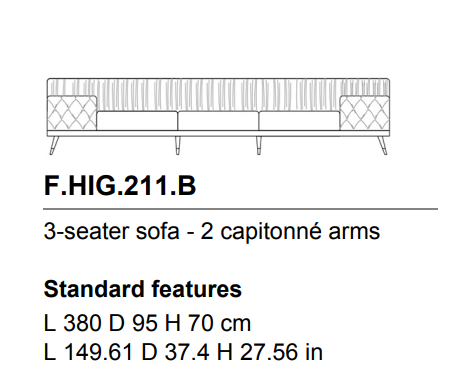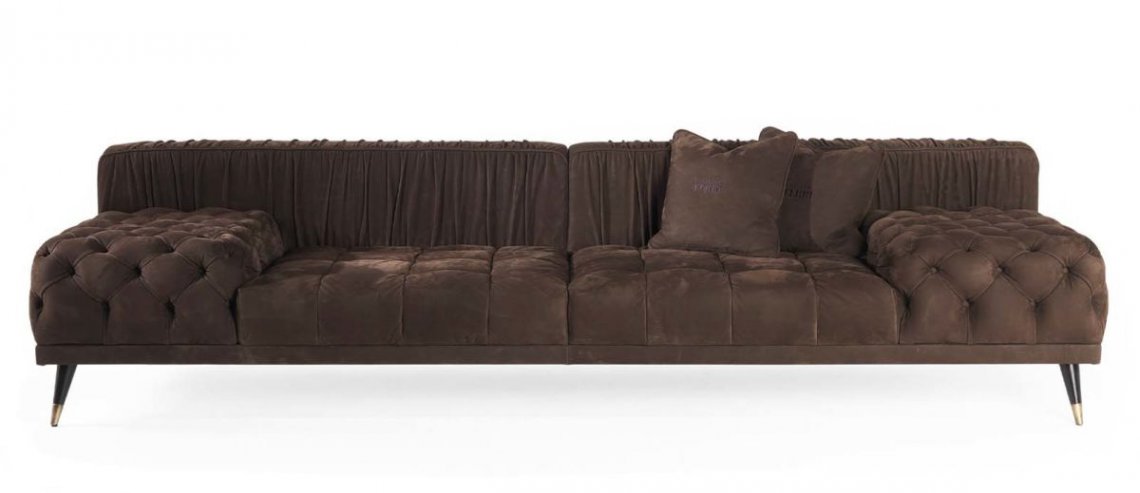 A sofa with a bold personality that combines essential design, contemporary lines and a high level of craftsmanship. The alternation between different finishings, with capitonné parts and pleating on the back creates a unique and refined set that expresses the sartorial skills of the brand.