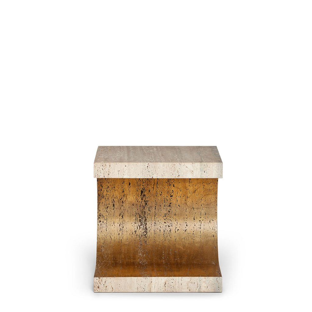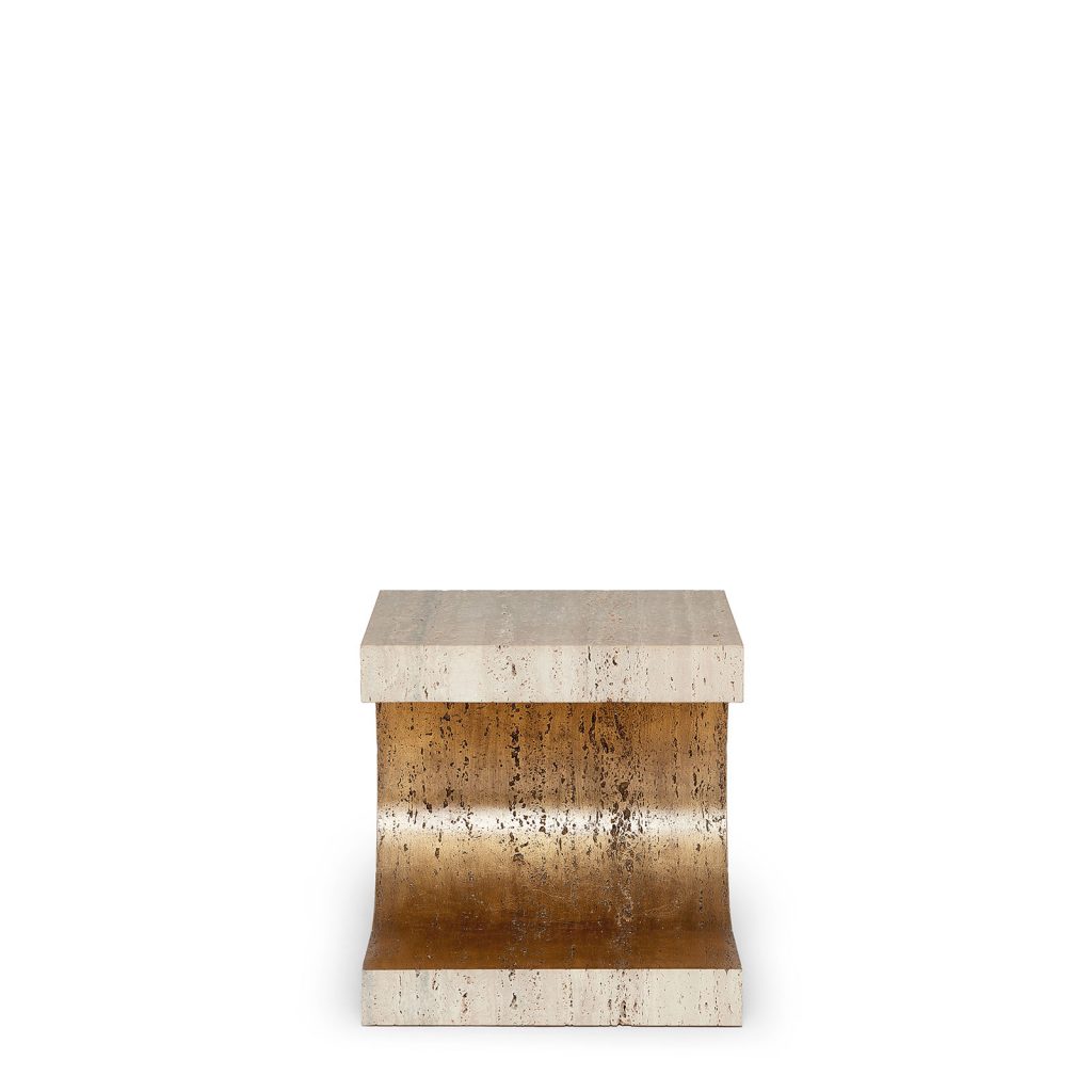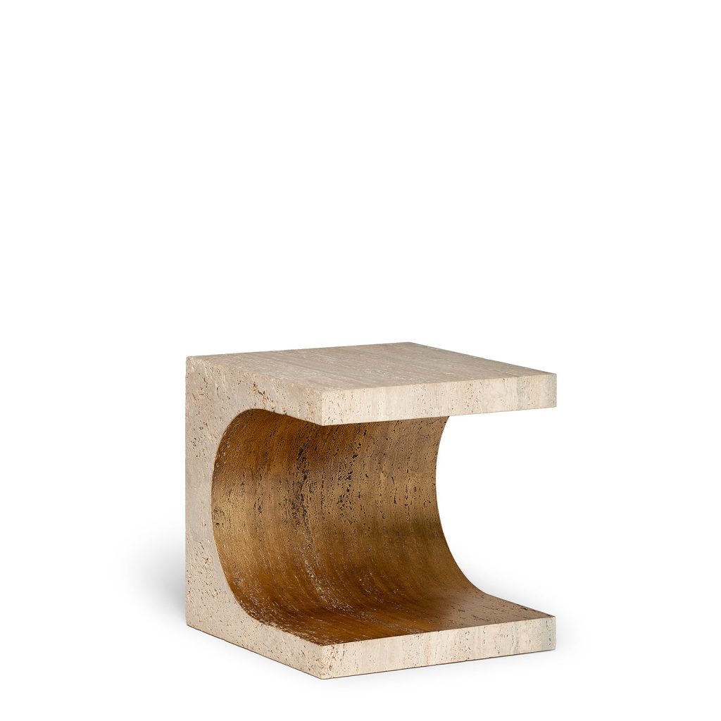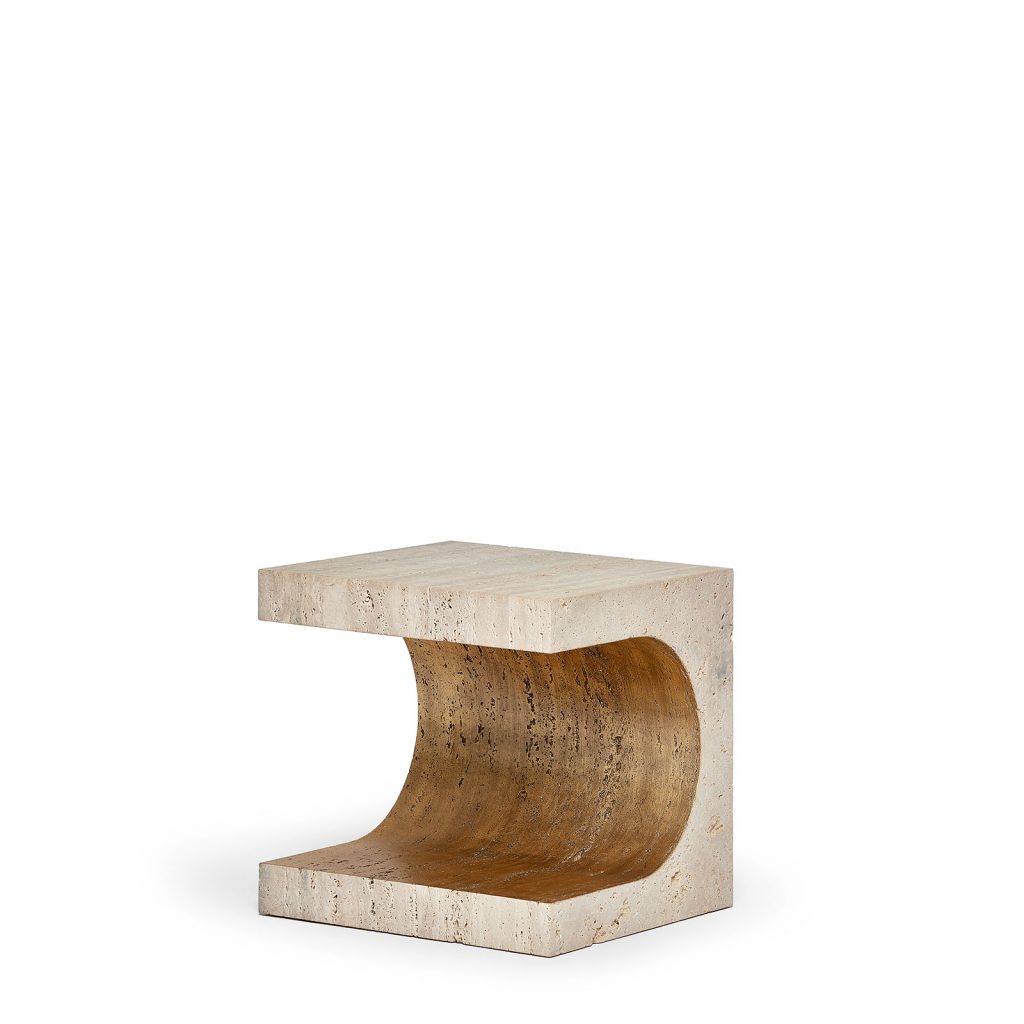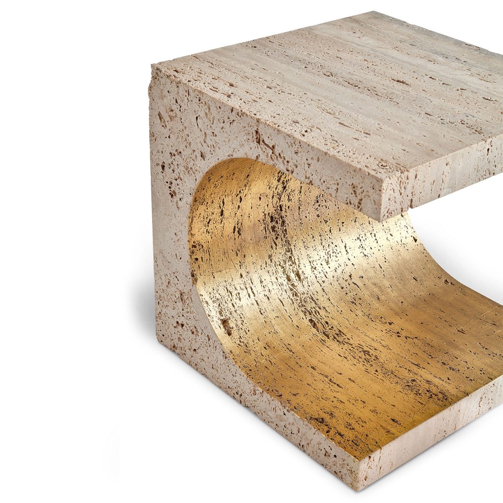 The Canyon Side Table is a keepsake of the enigmatic forces of Nature. Canyons are formed either by the movement of water or wind, or by the stillness of weathering. This side table is carved from a stone block, and the boundaries are either angular or curved. The porous texture of the Travertine breathes on the surface of the top and sides. And in its core, the gold leaf is hand gilded in the stone.