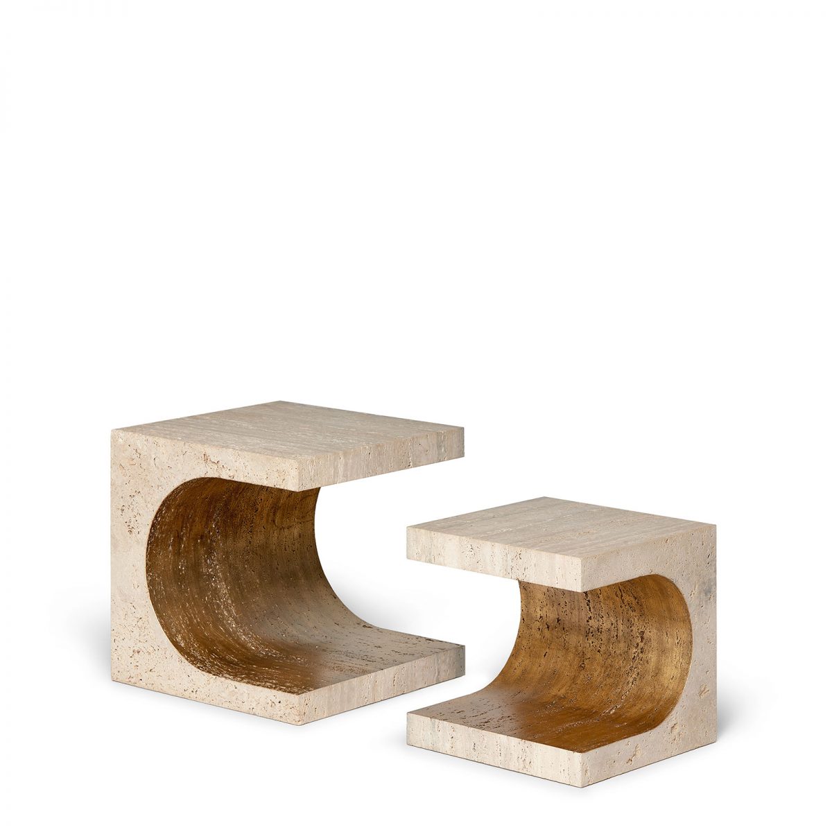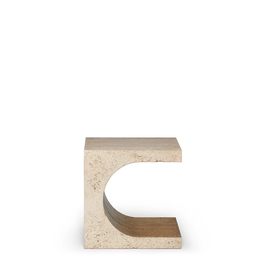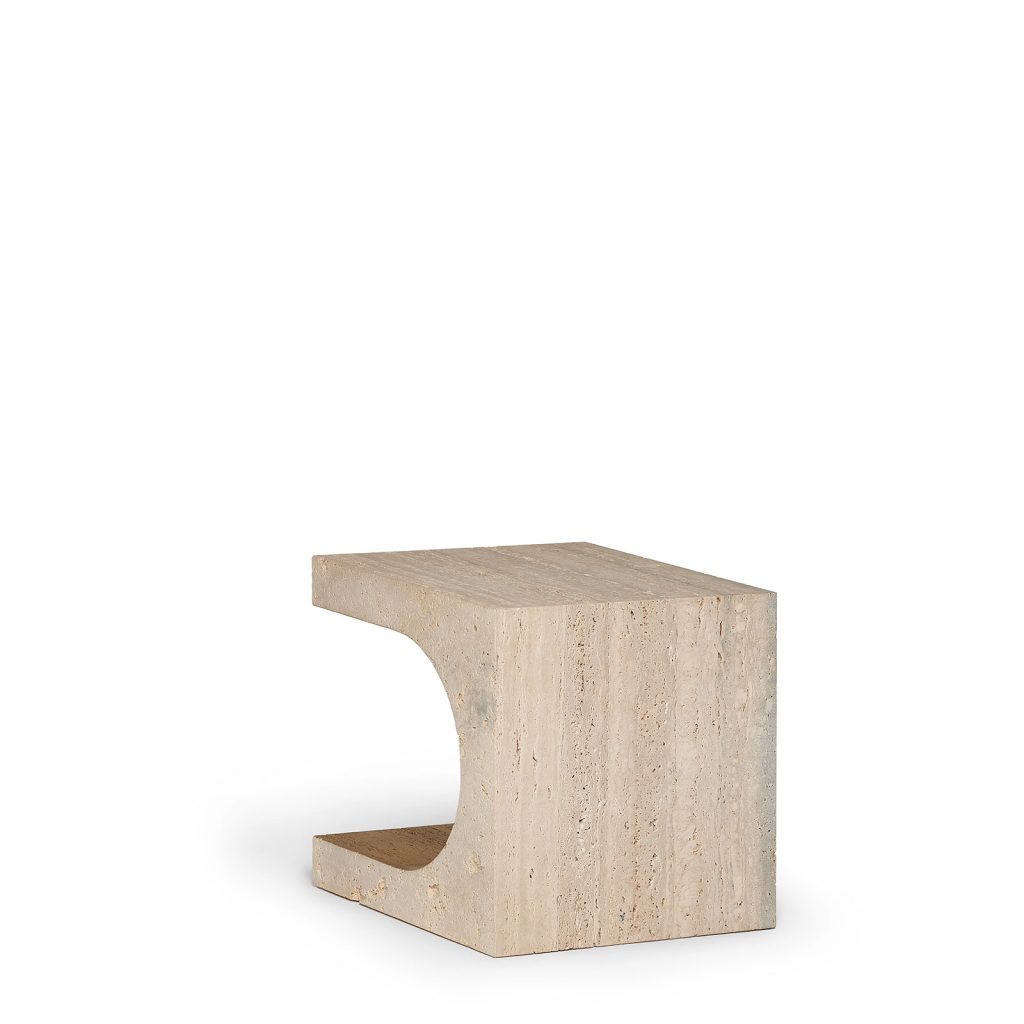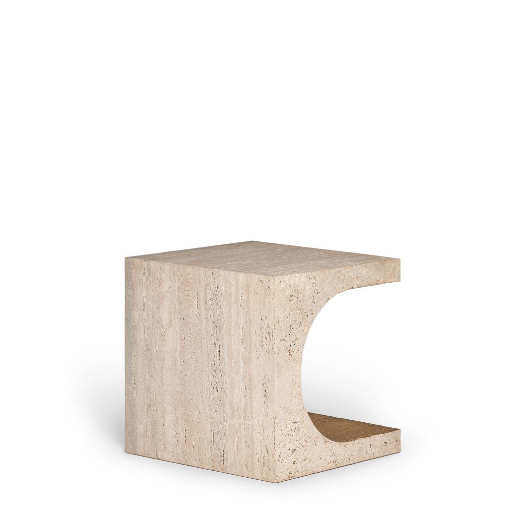 The Canyon Side Table is a keepsake of the enigmatic forces of Nature. Canyons are formed either by the movement of water or wind, or by the stillness of weathering. This side table is carved from a stone block, and the boundaries are either angular or curved. The porous texture of the Travertine breathes on the surface of the top and sides. And in its core, the gold leaf is hand gilded in the stone.