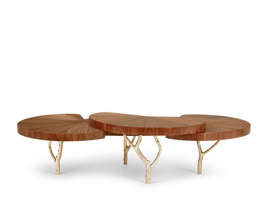 Springing from a low base made of fig tree branches in brass casting, the Lily Coffee Table creates a dynamic presence from its layered tops and the handcrafted wood marquetry. A delicate balance for a living space.