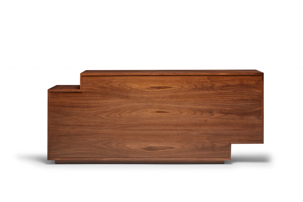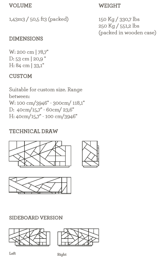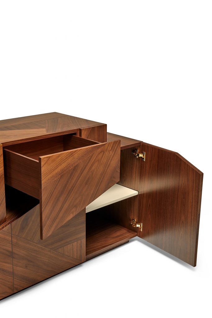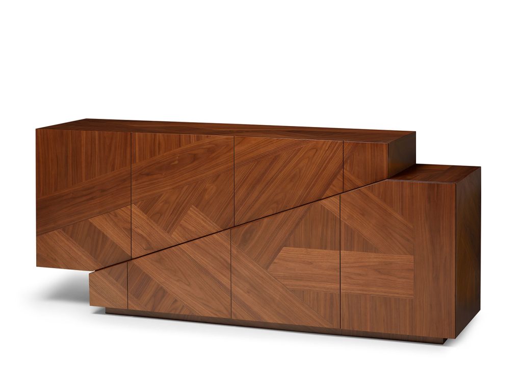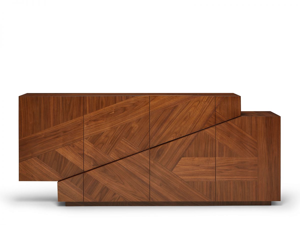 The Meridiano Sideboard is a contemplation on the polarities in Nature. North and south, earth and water, gravity and air, these poles coexist with seemingly impossible harmony. Intricate in design, its top and foundation standing in purposeful equilibrium, the Meridiano emanates magnetic character. The wood marquetry front, top and sides are the framing devices for three large drawers in marquetry and three doors with shelves in lacquer, made to keep objects of cardinal substance to a living space.